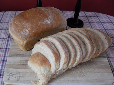 My mother gave me her Kitchen Aid mixer at Christmas that she has never used and I could hardly wait to mix up some bread dough. However she forgot to pack some of the accessories like the dough hook and the instruction manual so she brought the rest of the stuff last week. On Tuesday, we officially were out of bread but the recipe I wanted to try called for powdered milk which I do not have or use. So I checked the basic white bread recipe and decided to try for that one on Wednesday. A-n-d everything came out great! I substituted some of the bread flour for some organic whole wheat flour that I wanted to use up and used a couple of tablespoons of my organic sugar and both worked fine. The only thing I need now is bigger loaf pans as the bottom of the loaves are noticeably smaller than the the top.