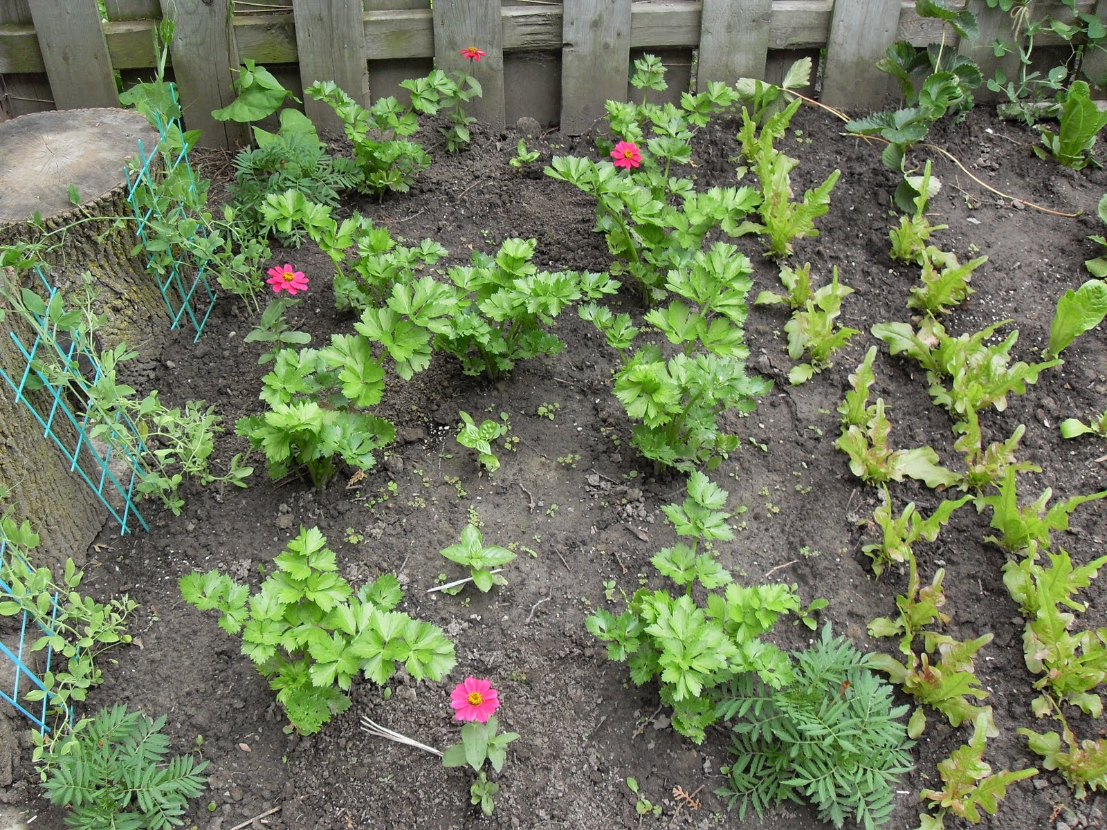 I planted the sweet peas next to the tree stumps but so far they have not attempted to bloom. I need to check into that. I have added some pink zinnias just for some color in the meantime. In the back right corner of the picture, you might be able to make out large strawberry leaves. My mom brought me a large plant from her neighbor in Pennsylvania. I have zero experience with growing strawberry plants so I have no idea right now what is going to happen this year or even next. (Actually my mom probably told me what the neighbor said about it, but I don’t remember at all. Sorry mom, you’re not the only forgetful one around here.) The leaves of the scarlet runner bean are behind the stump in the left corner and I am training them up the fence.