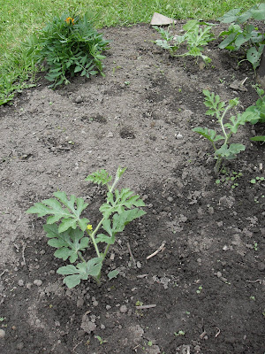 There is one tiny yellow flower on one of the watermelon plants and the plants themselves, except for one, are starting to take off. I had to do some major weeding here last week and plan on putting some peat moss down to help trap the water and keep the ground from drying out.