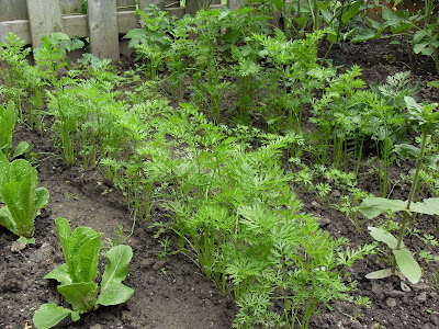 I didn’t mention in it in the first picture but the Bronze Arrow lettuce and the other Little Gem are both producing well. Here you can see the Romaine a bit and it is really providing a lot of nice leaves. We have been enjoying our own salad greens for the last two weeks. The carrots have been thinned and now there is room for them to really start growing.