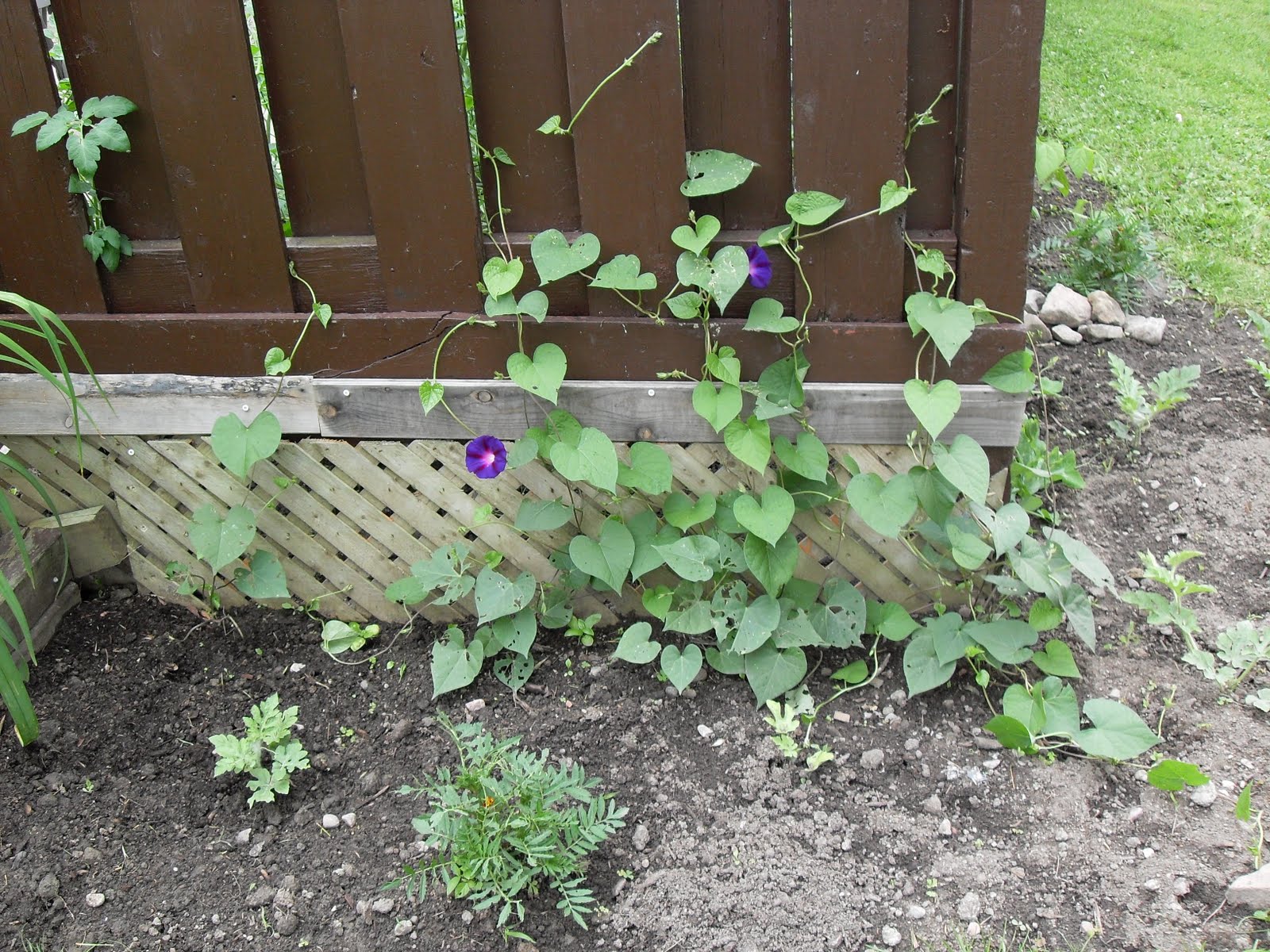 And lastly, the morning glories are climbing and blooming over on my neighbor’s side. They are on our side too but I didn’t take any pictures because they along with the sunflowers and the scarlet runner beans are being chewed up. I am trying various remedies but still haven’t figured out how to protect the plants. The leaves look terrible but the plants are blooming regardless.