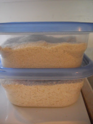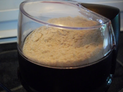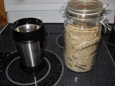 Next I grind up the oats which right now are old-fashioned rolled oats. Steel cut oats, which look like tiny pieces of oats rolled up in a tiny scroll would work as well as quick-cooking oats. So take your pick and grind them up too. (Note, if you are introducing one cereal at a time, then skip the oats and follow the directions for cooking the rice only. I myself started with just rice but then added the oats when I finally remembered to grind some.)