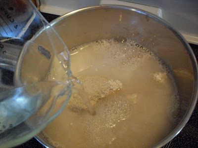 Add the measured cereal to a medium saucepan or pot and admire your work, unless your children are hanging off your legs crying for food, then get busy adding the water.