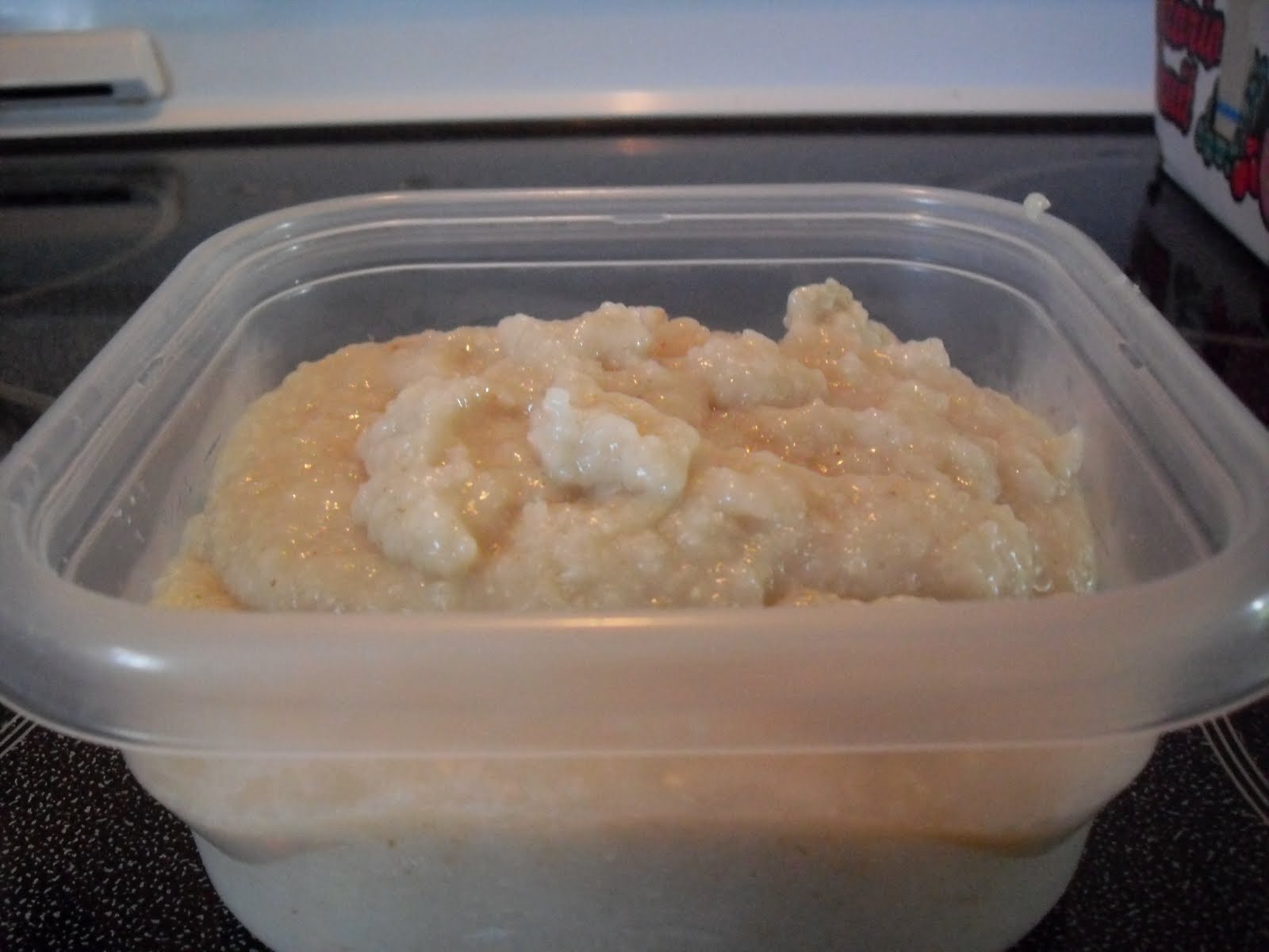 Once it has cooled sufficiently to be put into a container, it should all fit nicely into this medium container. I then refrigerate it until I need some at which point I put it into a microwaveable bowl and heat it until warm. It likely will be more firm than boxed baby cereals but my girls have no problem with the texture and Special K doesn’t chew her food yet so it works well for both of them.