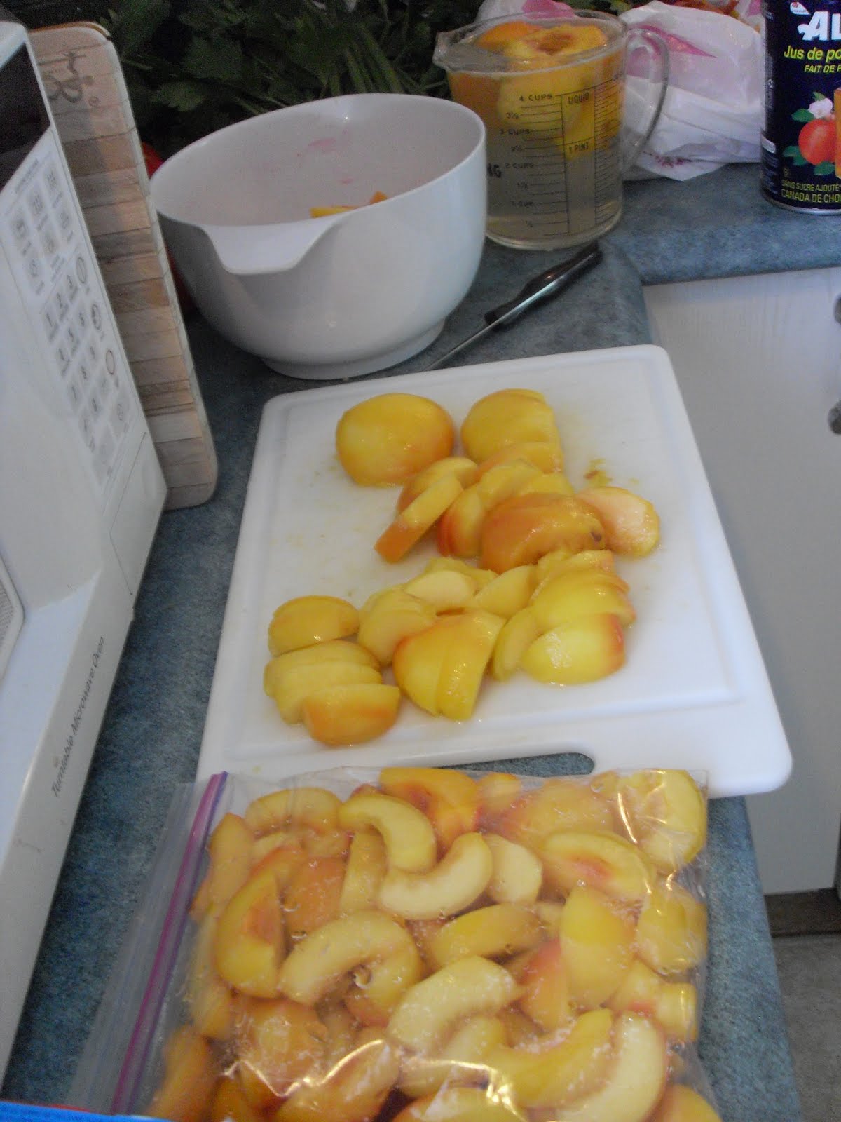 I didn’t grow these peaches but this is how I froze them. Blanched to get the skins off, quartered them and put them in plastic freezer bags with a drizzle of apple juice to help keep the color.