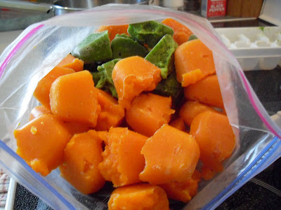 I will be soon harvesting the carrots to make more of these, baby food cubes. My girls eat carrots, peas, green and yellow beans, lima beans, sweet potato and squash all prepared this way. Baby Laura will eat the cooked pieces as finger food but Kate still doesn’t chew well so she needs it be pureed.