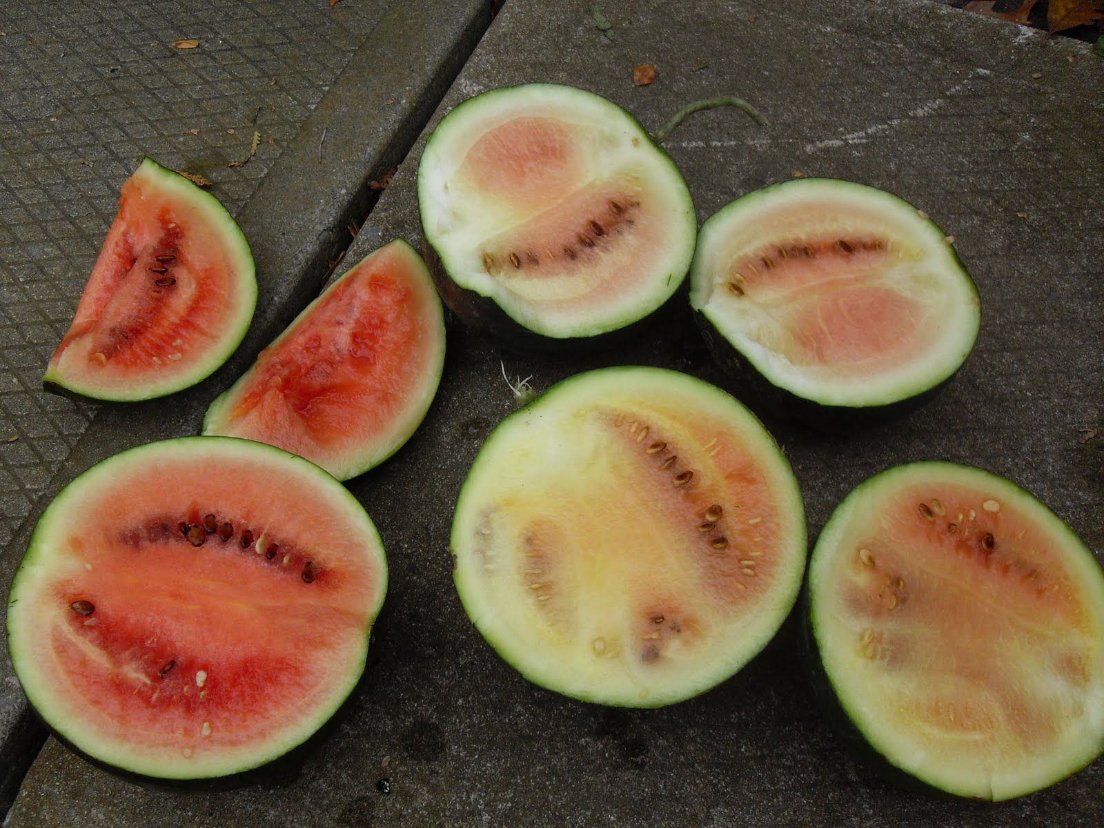 Sugar baby watermelons. The ones on the right didn’t get as ripe before the plants died. The one on the left, while not as pink as we are used to has a fantastic flavor. And that was the only one that got that pink.