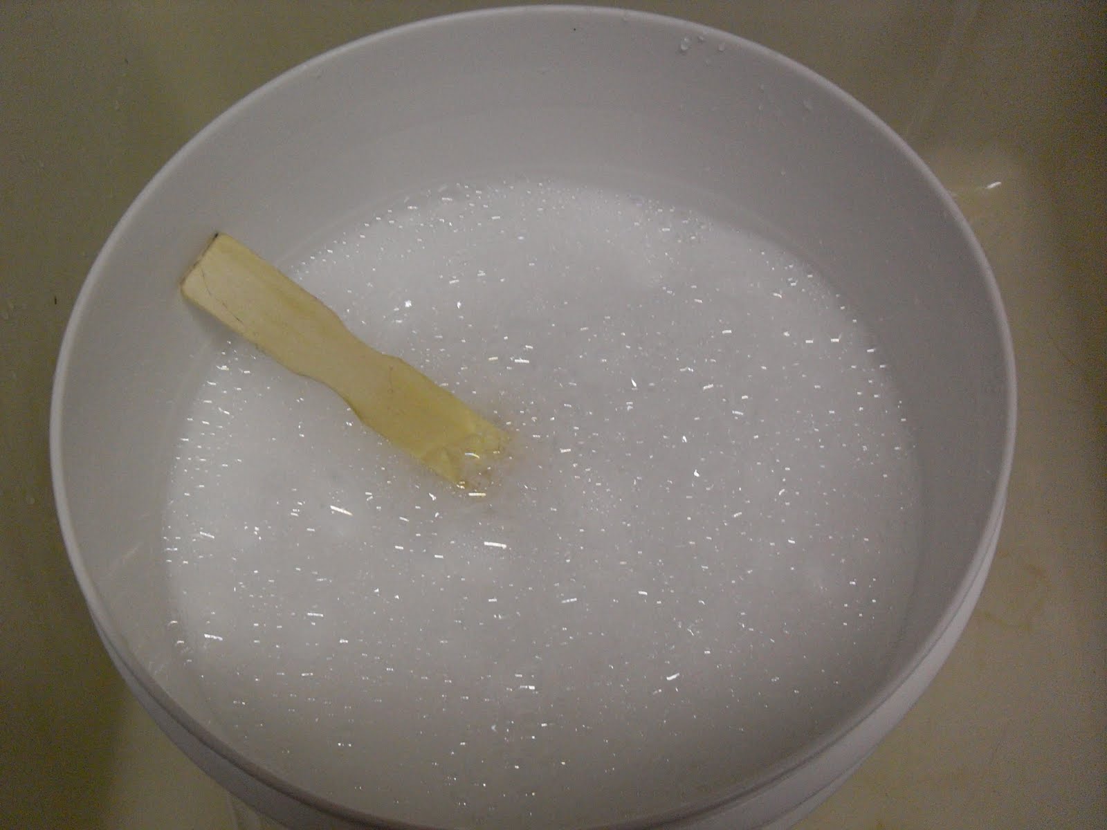 Okay, so next I add four cups of hot water and stir well. If you are using bar soap this step would be more important so that you completely dissolve all the pieces of soap. That’s not an issue here, but since I always follow the directions(ha!) I still do it like this.