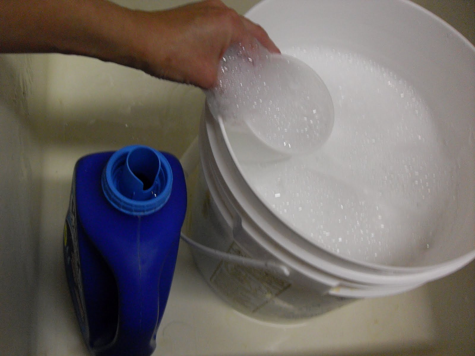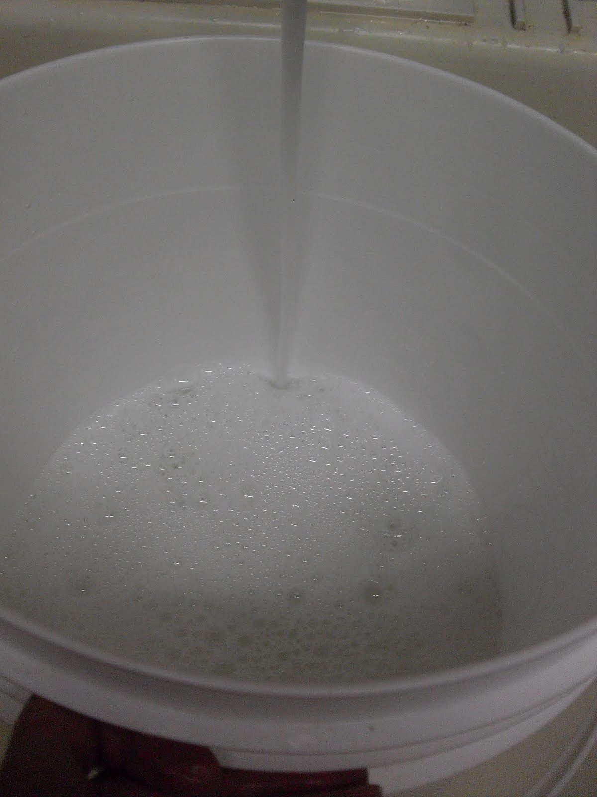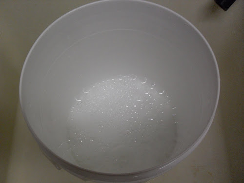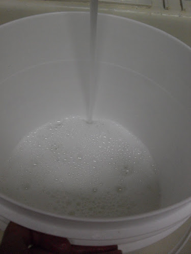 Next, I add about three gallons of warm water. This amount varies as well with some people only adding two gallons but it appears to be very effective with three gallons of water so I would say stretch it as much as you can. (Yes, that is my hand holding the bucket up to the tap, freakish thing.)