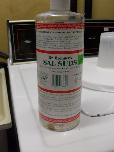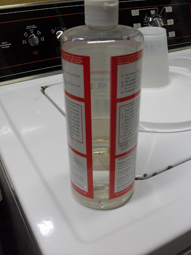 Next I measure carefully(I did at first, now I guesstimate and pour), one-third of a cup of liquid soap. Pictured here is Sal Suds, but I’ve also used Castile soap, which is usually available at natural food stores. The original recipe called for shaving ivory soap bars, but that’s too much work for me so I buy liquid. Feel free to use whatever is available. Now, I realize that the bottle looks empty here.