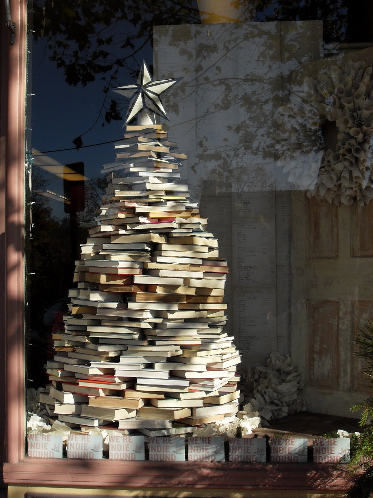 photos: the bookstore; it’s seasonal window display; the church grounds; the steps leading down to the street and bookstore; looking up; sitting on the bench and looking down.