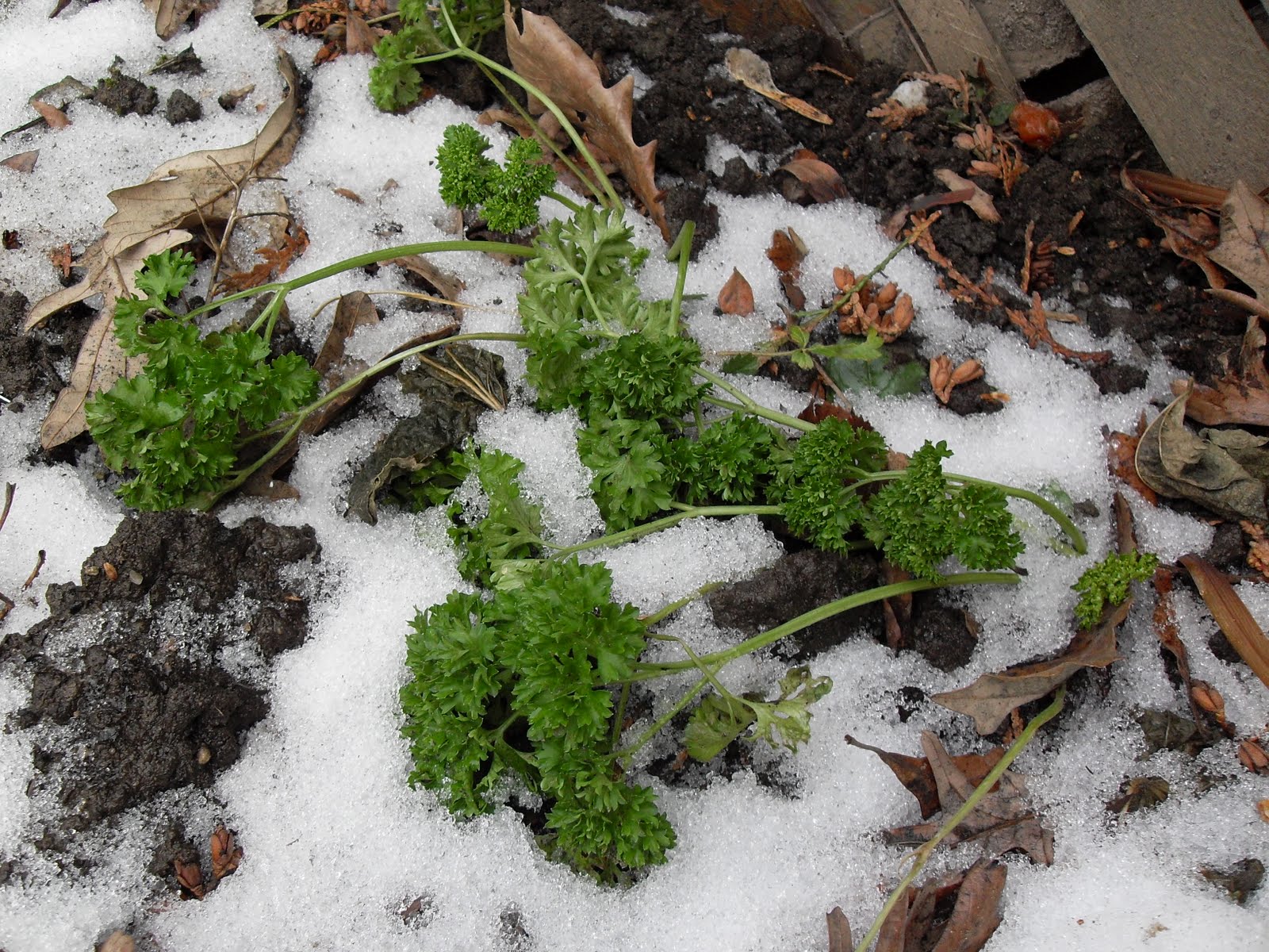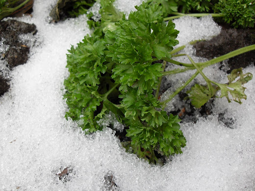 Also bearing the colder weather well is the parsley. I keep forgetting to go out and cut it and it keeps peeking through the icy crystals and scattered leaves that keep trying to bury it.