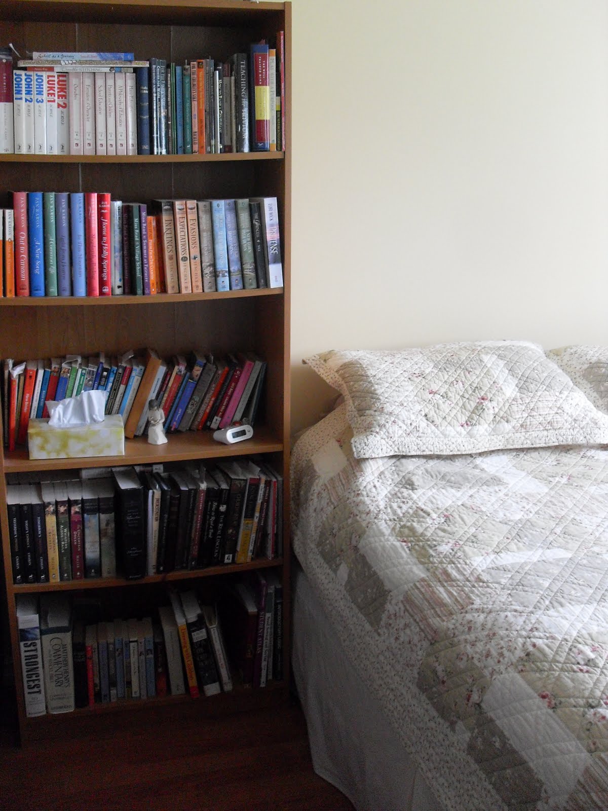 Growing up, I slept surrounded by my bookcases so married life hasn’t changed that. Although it is more library than bedroom at this point, as there are three more bookcases along the left wall supporting what would be considered our theological library.