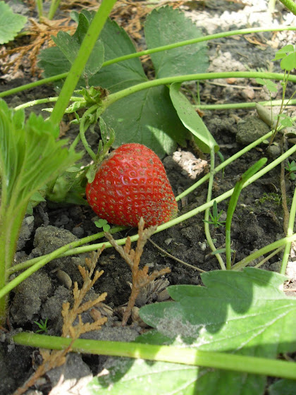 The imported strawberry plant is thriving quite well in its new over-the-border location =)