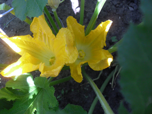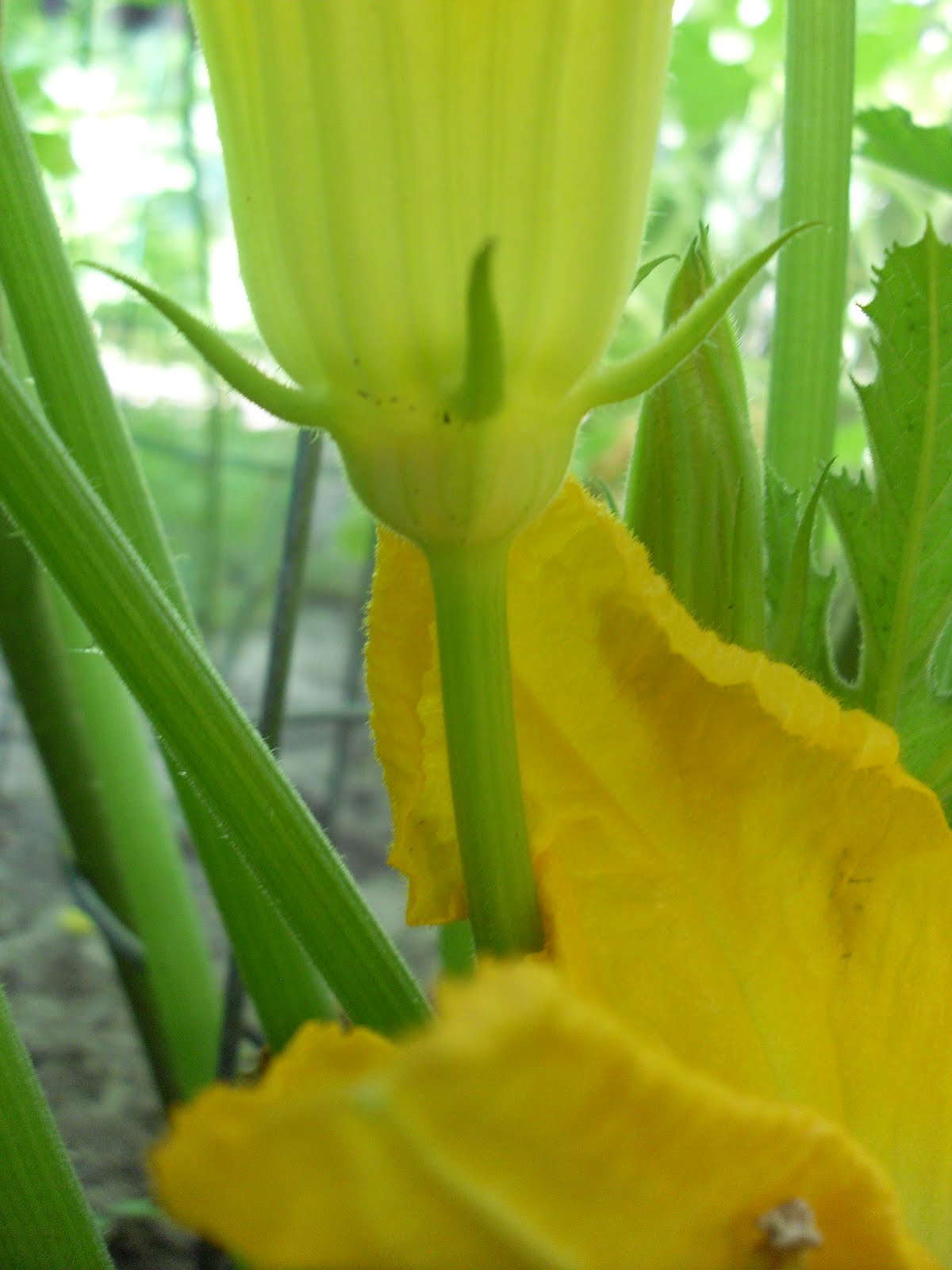 Here there are two blooms, a male and a female open at the same time. This is a perfect time to hand-pollinate.