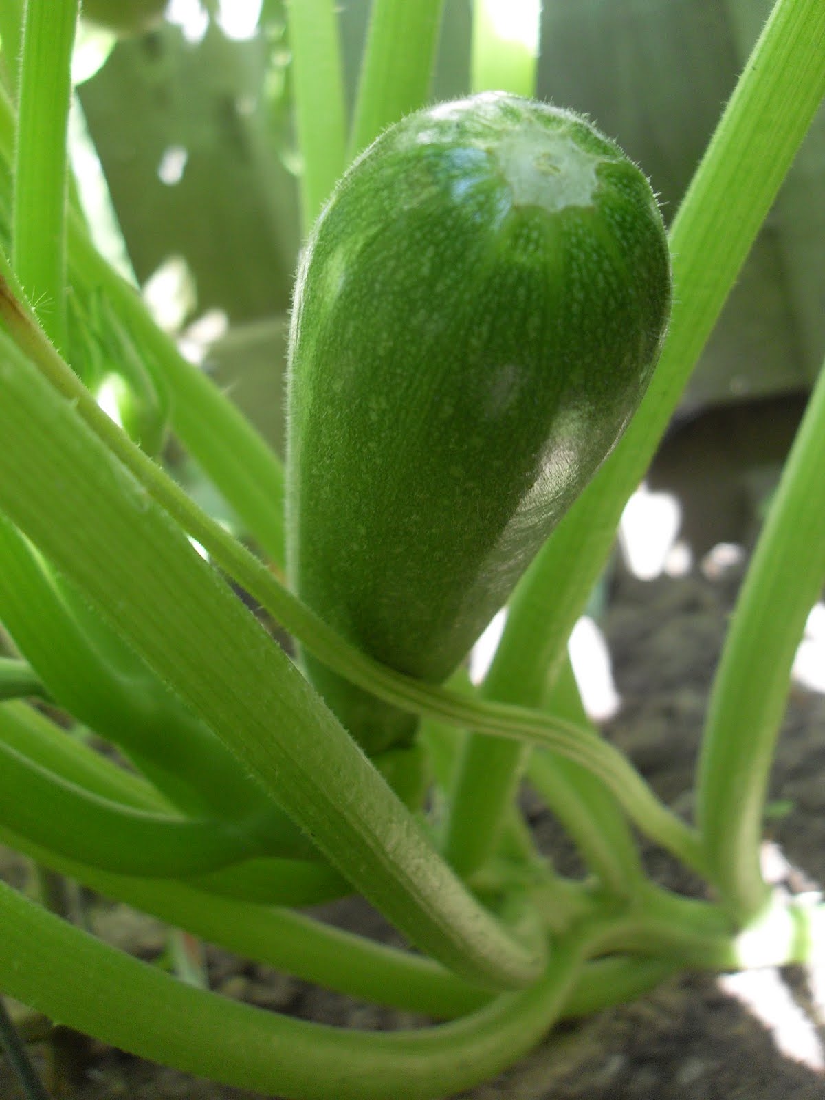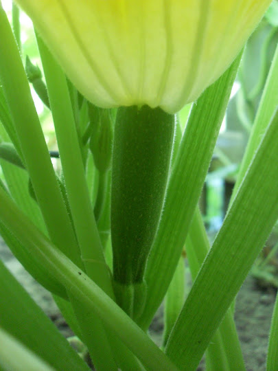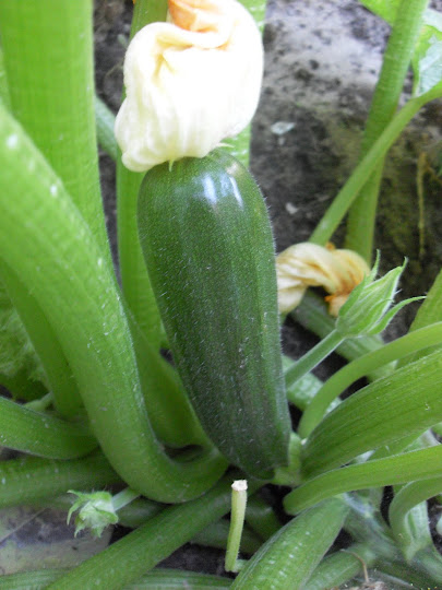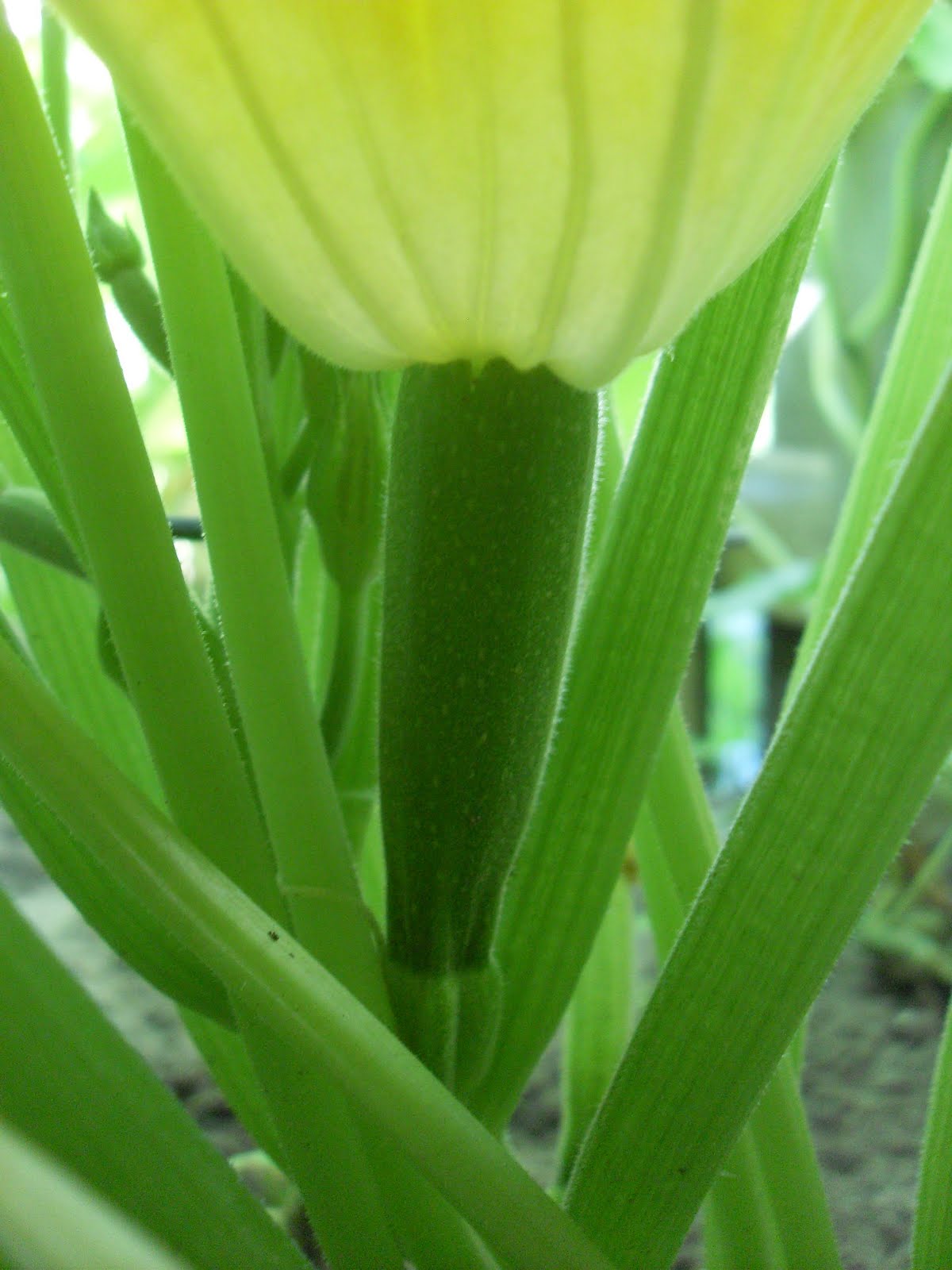 The female flower with the mini zucchini already growing but needing further pollination to mature.