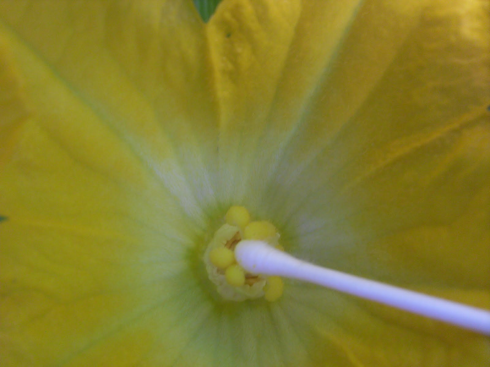 To help with the pollination, I simply used a q-tip to get some of the sticky pollen off of the male flower and transfer it to the female flower(shown).