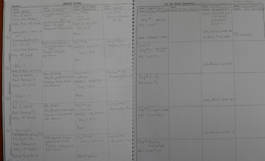 Several weeks ago I posted part of my homeschool to-do list and I have been working very hard to cross items off. It feels great to get lessons planned and ideas thought out ahead of time. I’ll post the original list with my updated notes after each item in green and in between, I’ll sprinkle photos of our books that we will be using this year.