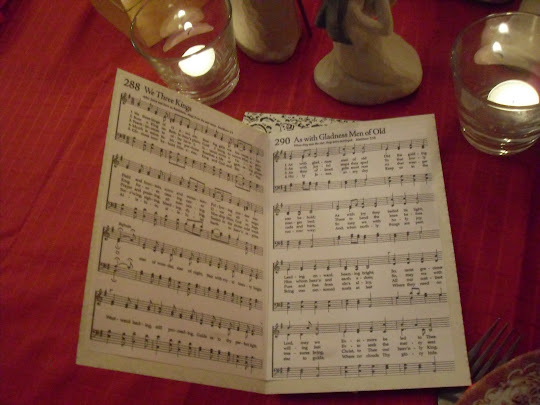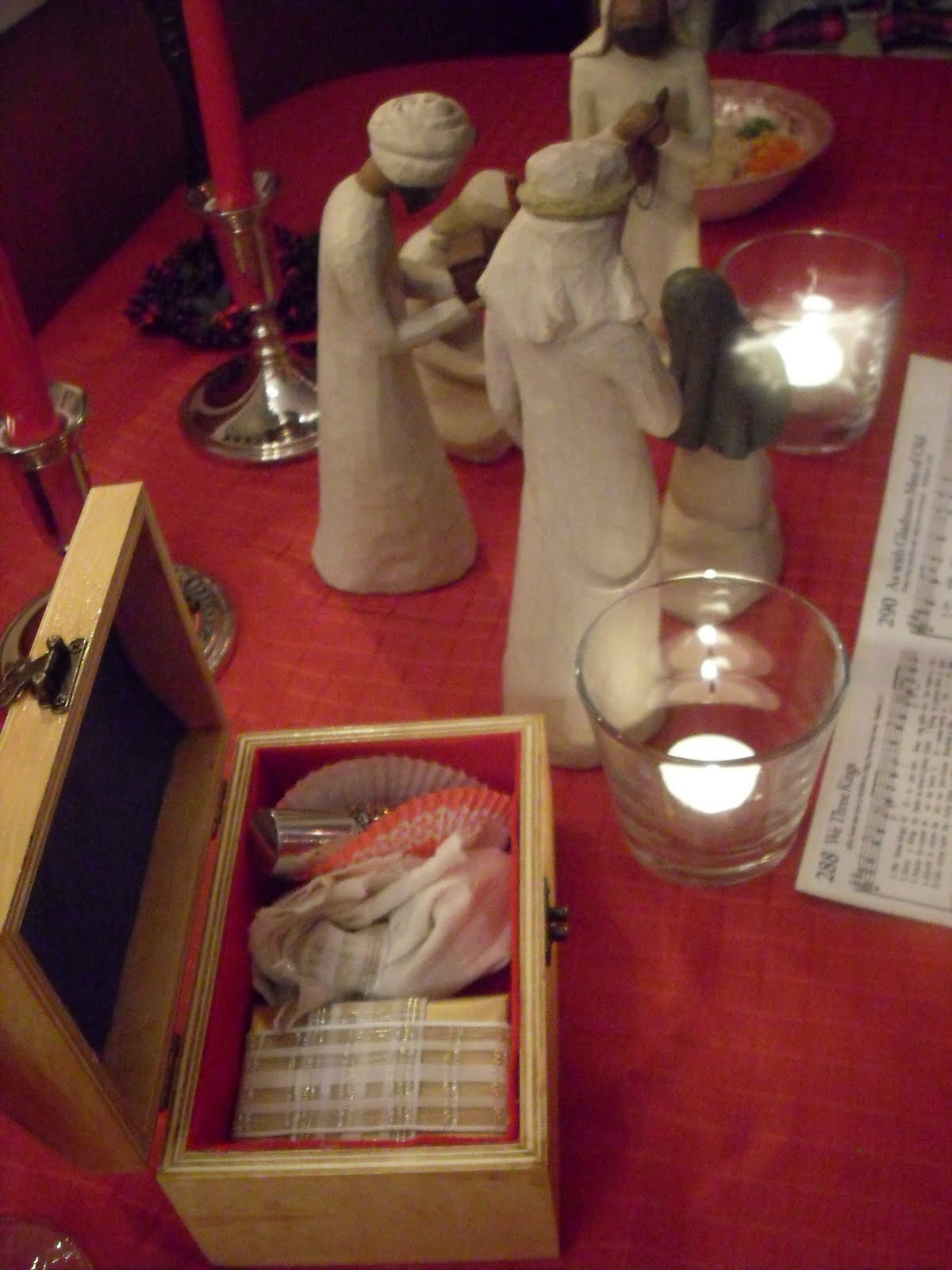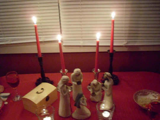 Lots of candelight and fancy table settings were easy to do. Decorating with the wise men adoring King Jesus and some tangible representations of their gifts seemed in order. (The homemade gifts perhaps need some tweaking, but it was what I had on hand this week to work with. Golden wrapped box, glittery cologne bottle, and a sachet filled with incense items of orange, cinnamon and cloves.) We dressed up a bit for our celebratory feast and dined on chicken, rice pilaf and almond green beans which was simply an easy and popular meal for our family. Shane had to miss as he had already committed to another activity with his brother.