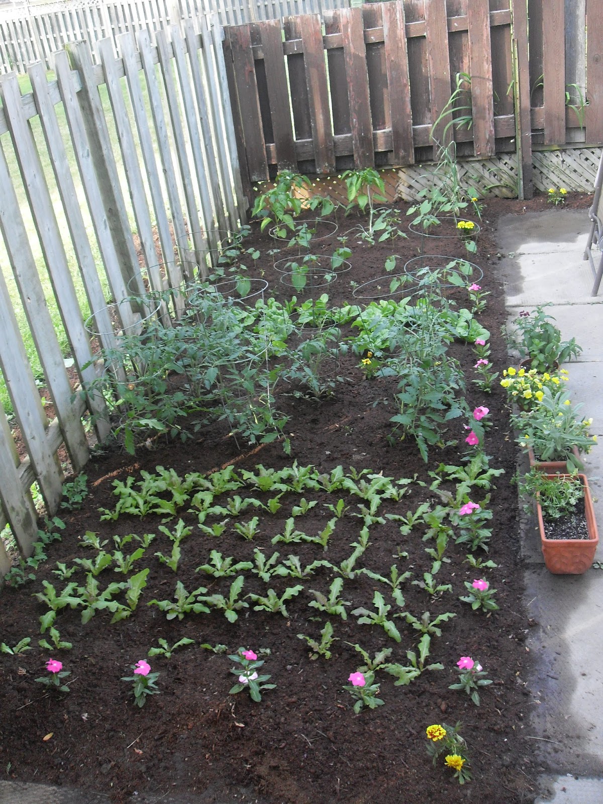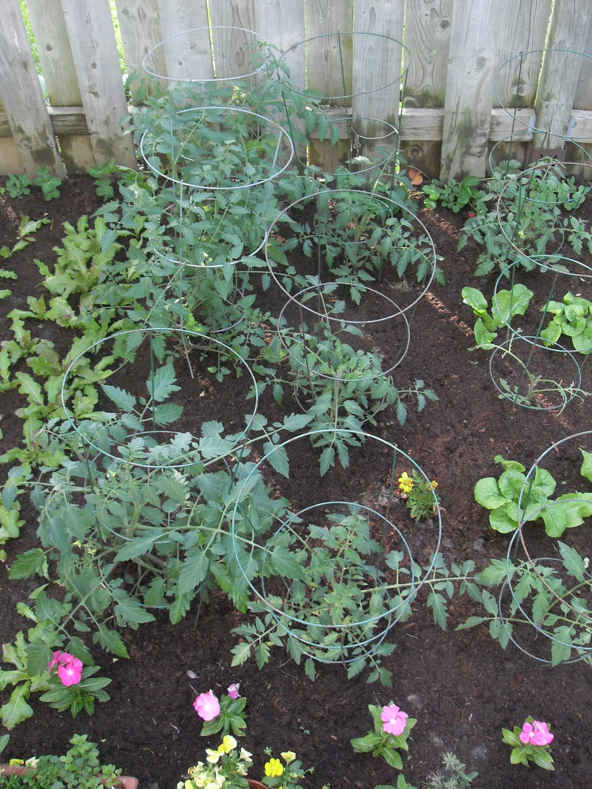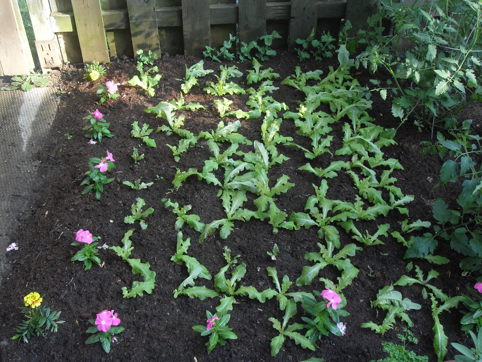 lettuce seedlings? Most of it was the Bronze Arrowhead variety and they are doing quite nicely now. The pink flowers flanking the garden are vinca and they are mostly serving as a colorful deterrent to two busy girls who would really like to play in Mama’s garden.
