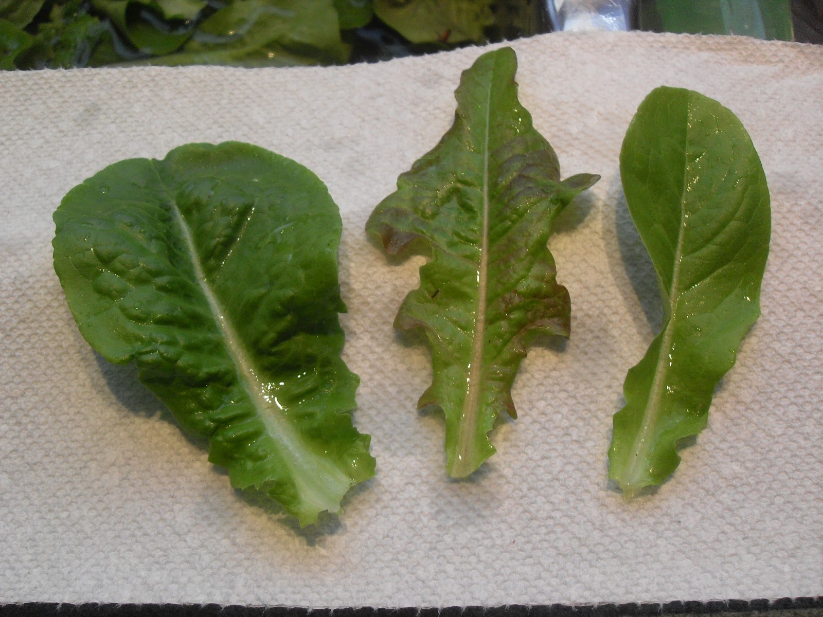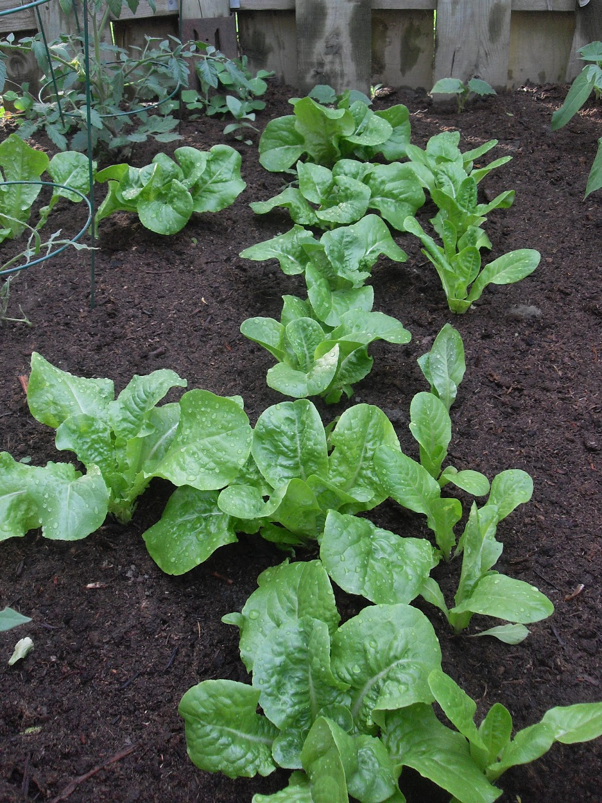 Here are the three varieties of lettuce growing this year: (from left to right: romaine, bronze arrowhead and little gem)