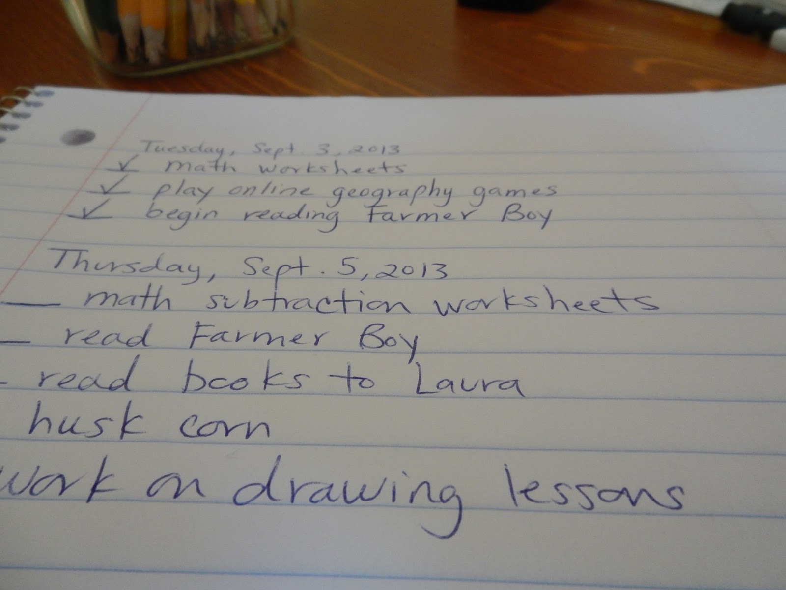 Then we break for a snack or lunch depending on when we get finished. Seth has an Independent Work List notebook where I write down tasks or assignments for him to complete on his own. Examples of work in a moment.