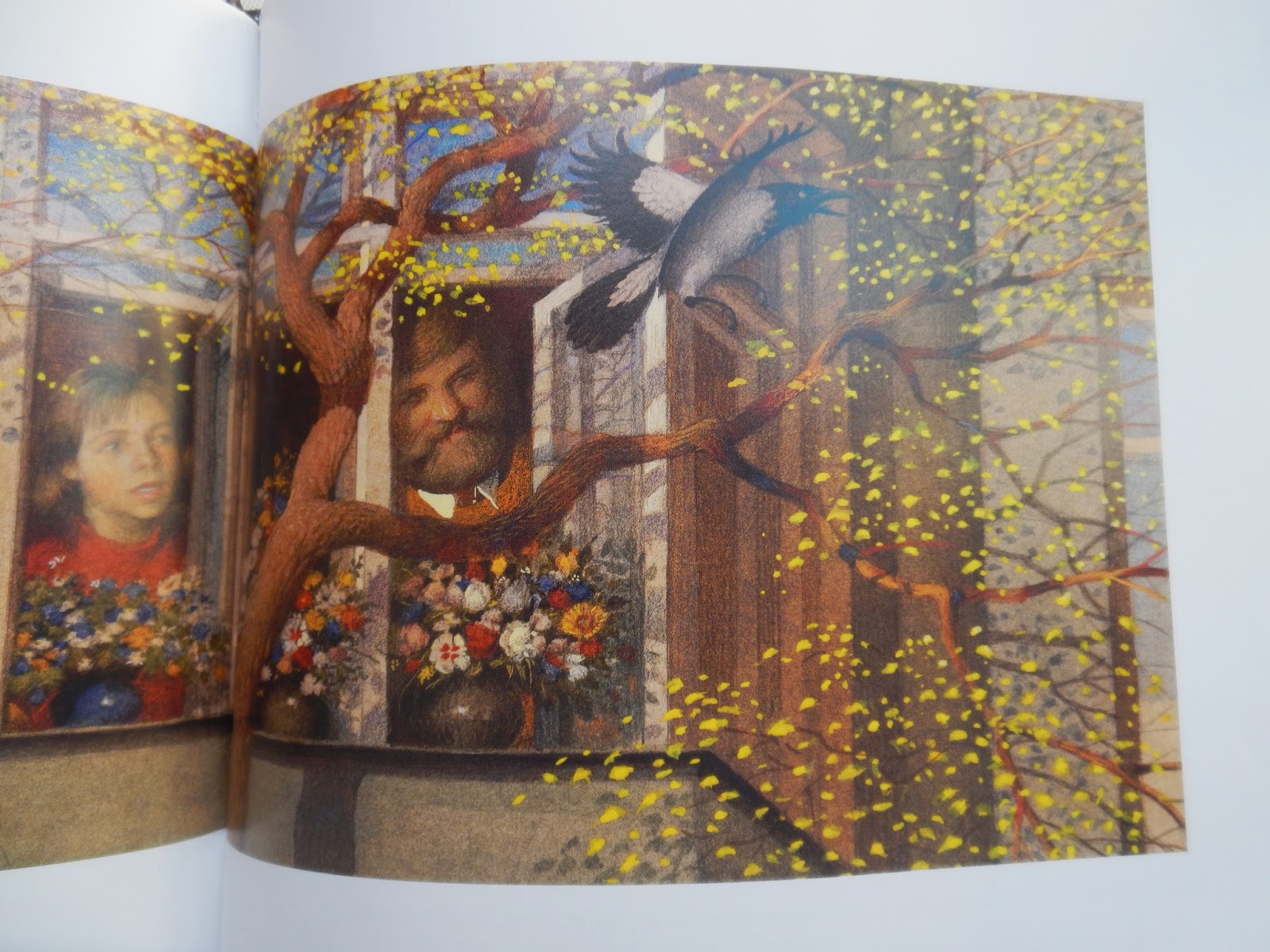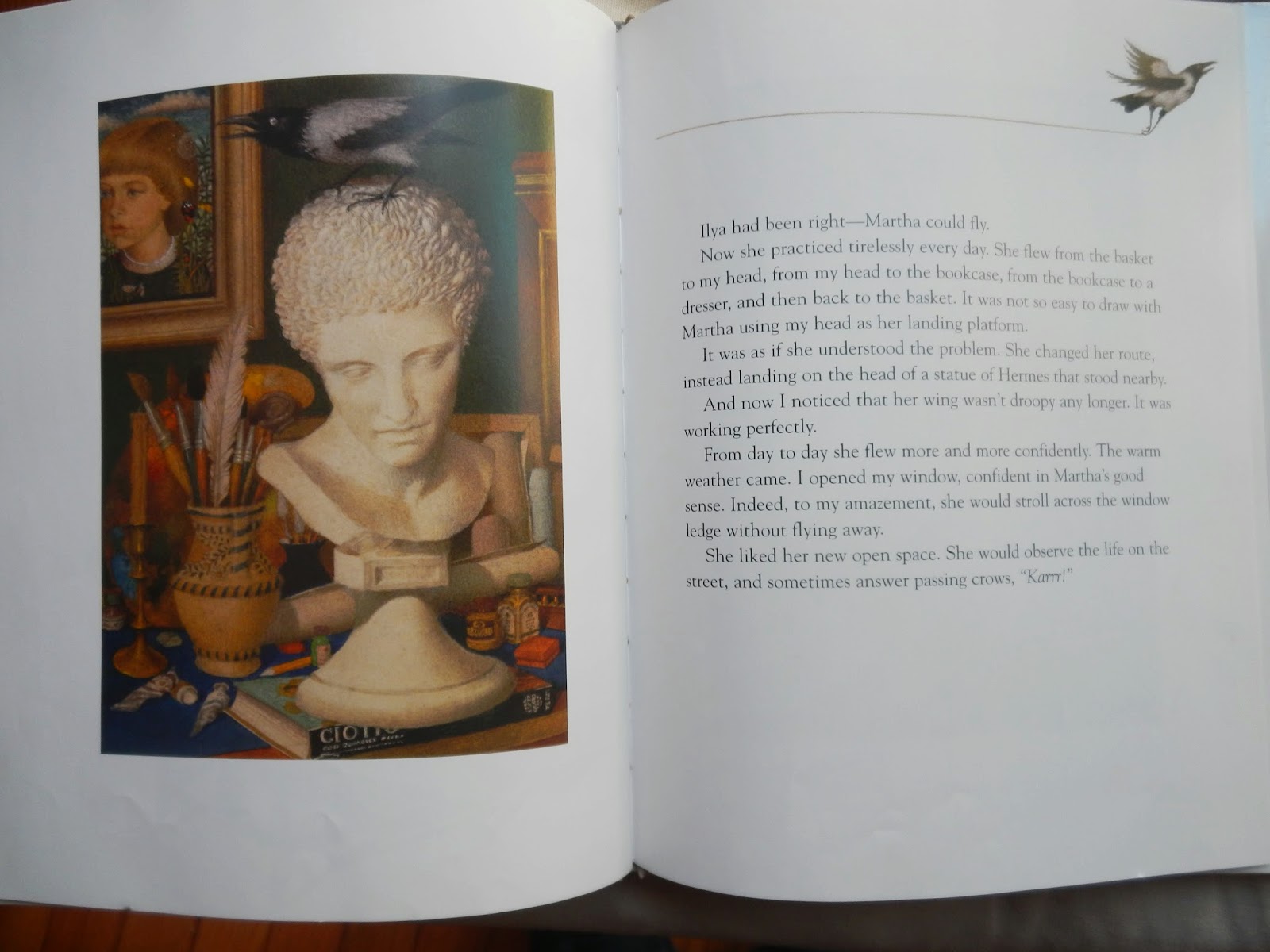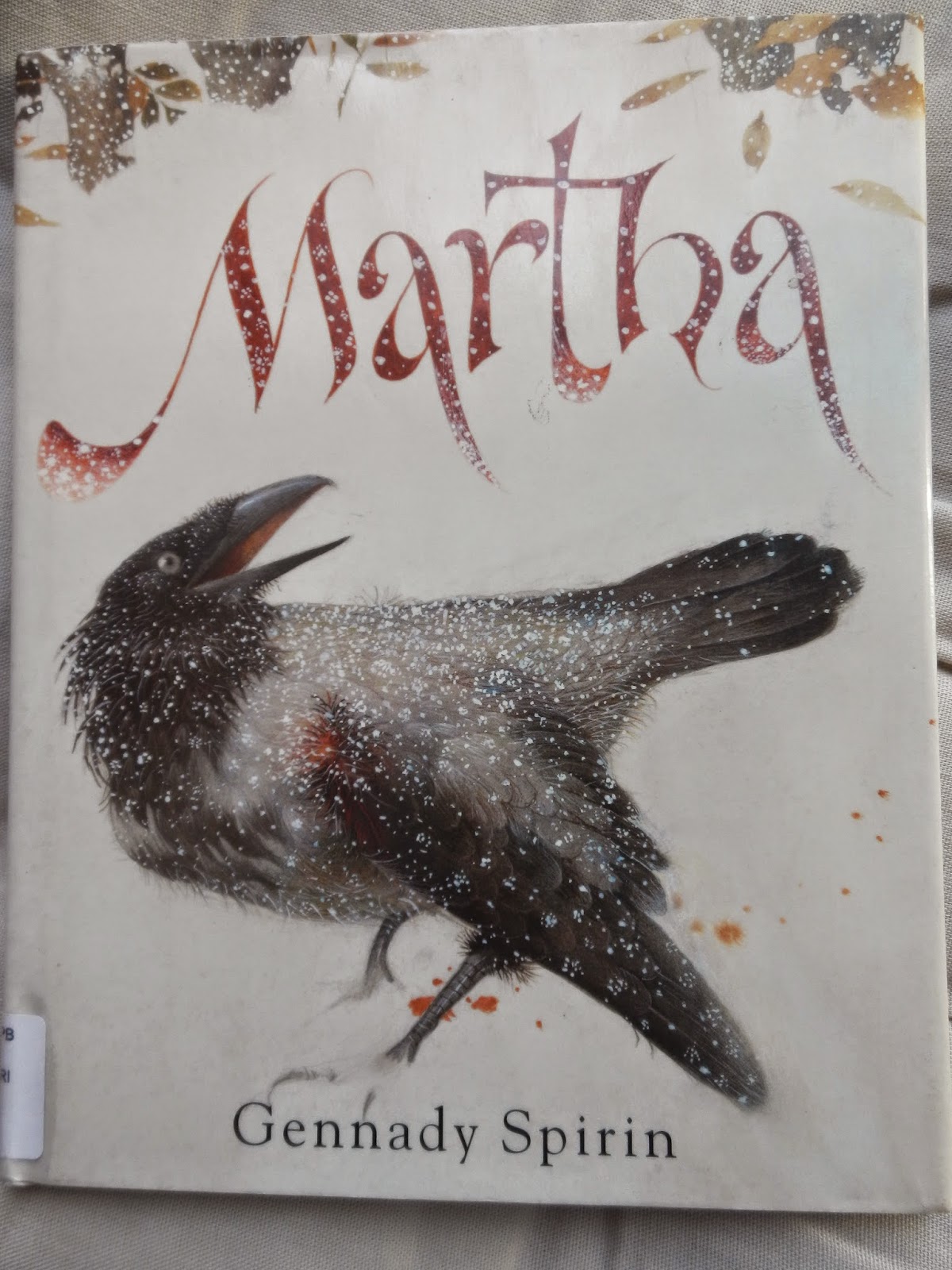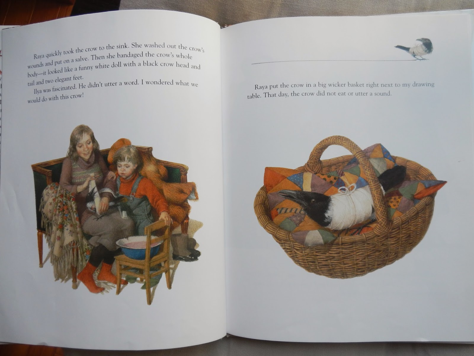 We have a ton of crows in our area of Ontario which provides many opportunities for us to observe their behavior, so this book seemed like one we would like. It is set in Russia and tells the true story of the author’s family who befriended an injured crow and nursed it back to health. I loved the illustrations and have shared several of my favorites.