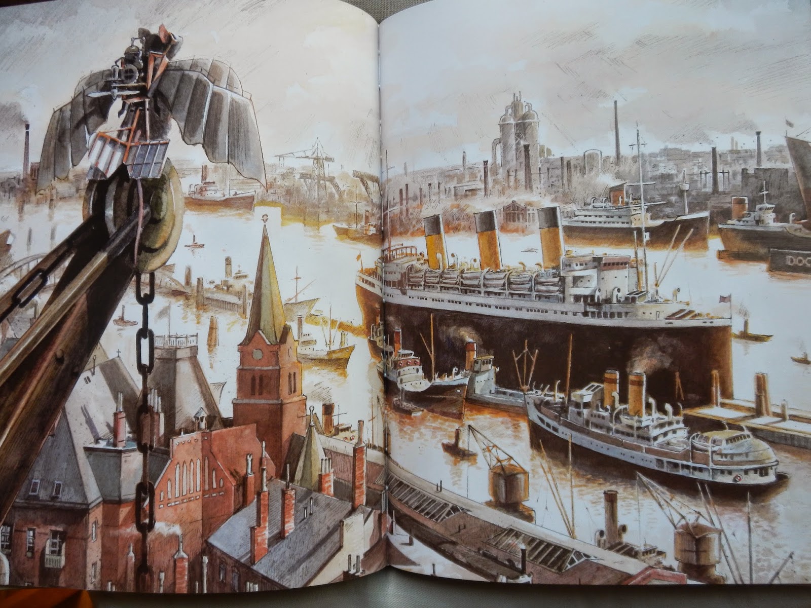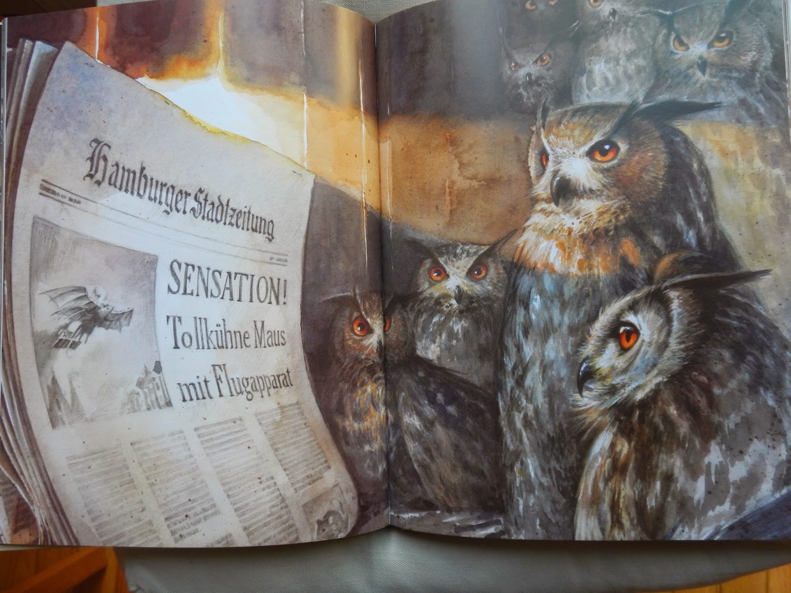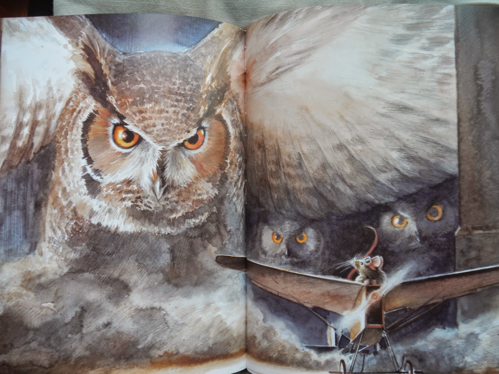 I have not saved the best for last, but this is my most favorite for this time. And it’s not the story plot, really. It’s these wonderful, enormous, detailed illustrations that cause you to stare and stare at the pages. And if I may skip ahead, the German author, Torben Kuhlmann, has a second book due out in Europe next year called Mole City and it looks amazing. I am hopeful that it will be released in North America as well so we can see what the Moles build underground. But back to this current book which relates the efforts of a small mouse to cross the Atlantic by plane and reach the New York harbor just like his human namesake, Lindbergh. If only those owls were not so interested in having him for dinner…