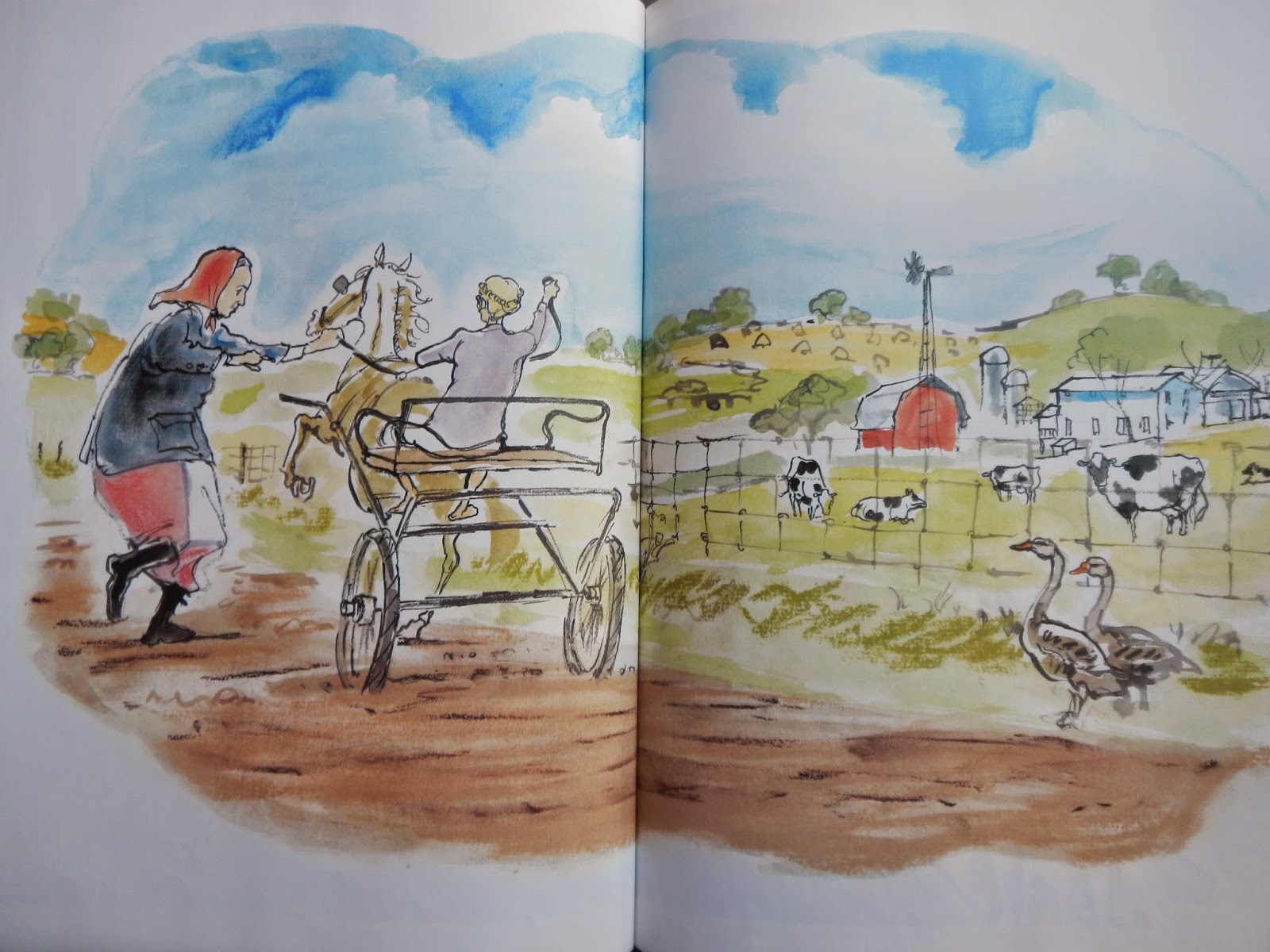 I picked up this one because I recognized the married author/illustrator team from their other well loved books, The Library and The Gardener. While the actual story seems a bit weak, (young Amish girls travels into the city, but remembers her Amish life back at home), the illustrations provide plenty to enjoy, including the end covers at the beginning and end of the book.