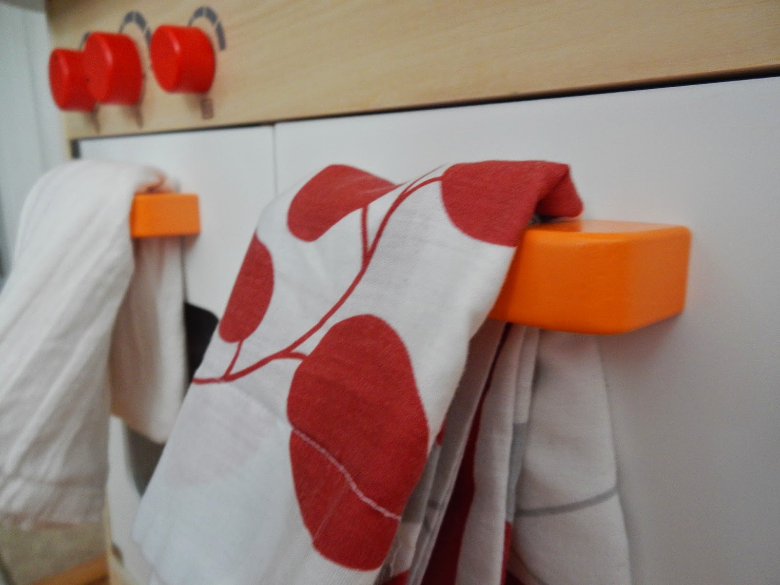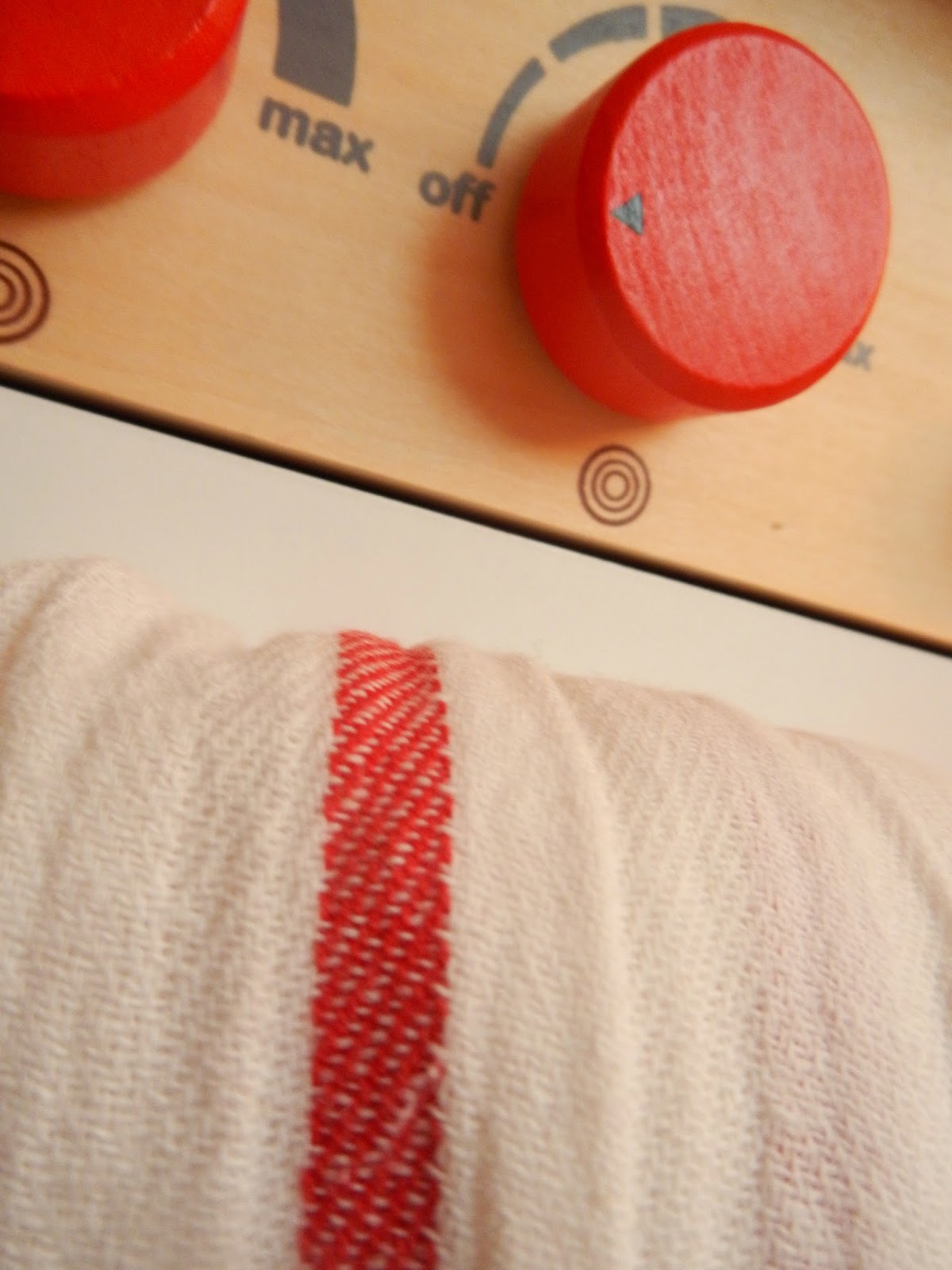 The girls have a new, very small kitchen to use for whatever kind of play they want. I added some fresh linens because every kitchen needs pretty hand and dish cloths to work with. The red cloths are made with love from our thoughtful friend Kathleen and hang just nicely on the handle, ready to wipe any small hands or major spill. The other striped hanging linen come from where else, but Ikea. I used three of them last year to make a runner for a table at my parents’ fiftieth anniversary party. I bought three more last week so the girls and I could share them.