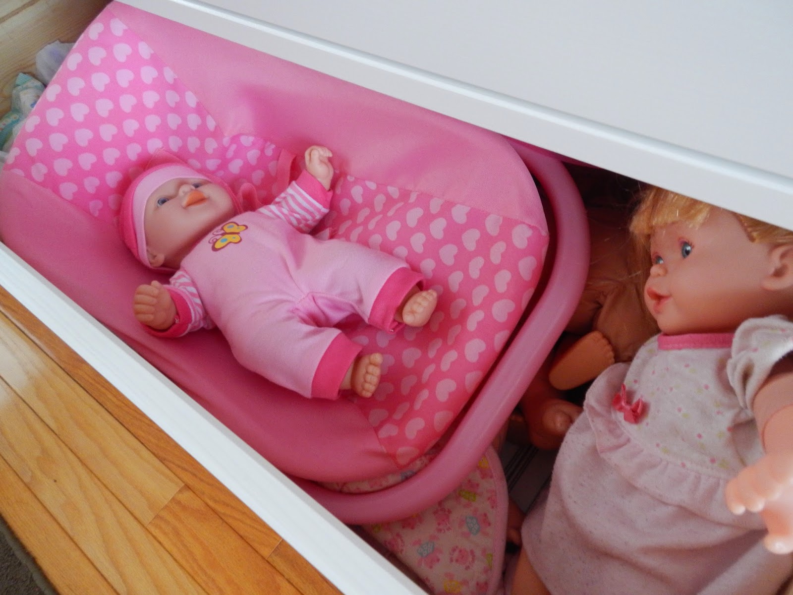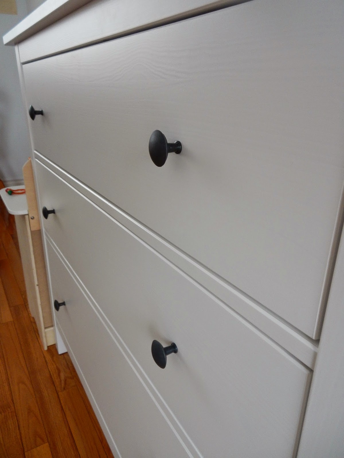 Our old-school dvd collection is housed in the first two drawers and the girls’ dolly stuff resides with pull-ups and diapers in the more accessible and deeper bottom drawer. The drawers slide so easily and are lined with elegant paper straight from the Ikea factory.