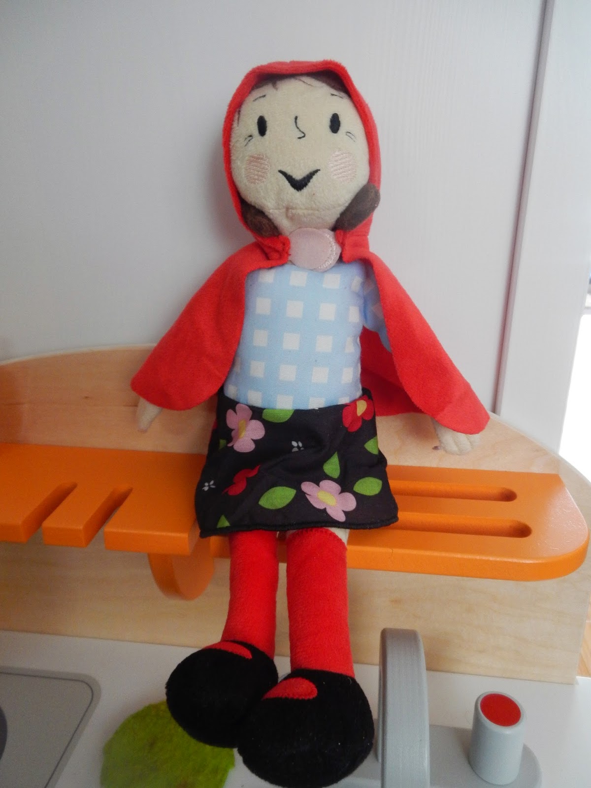 And this one is because Laura seeing me with the camera, asked for me to take picture of Little Red Riding Hood hanging out in her kitchen. I assume she was there to cook something for her granny. Little does she know that her granny has already been taken by the wolf. He is nicely dressed with suspenders, but in the end, his felt teeth were too scary for Laura, so he was left with the granny in his arms in the wire bin at Ikea and a cute tame mouse with a scarf was brought home instead. Possible nightmare-producing material avoided and a delightful cape-wearing girl was welcomed on Christmas day instead. All is well.