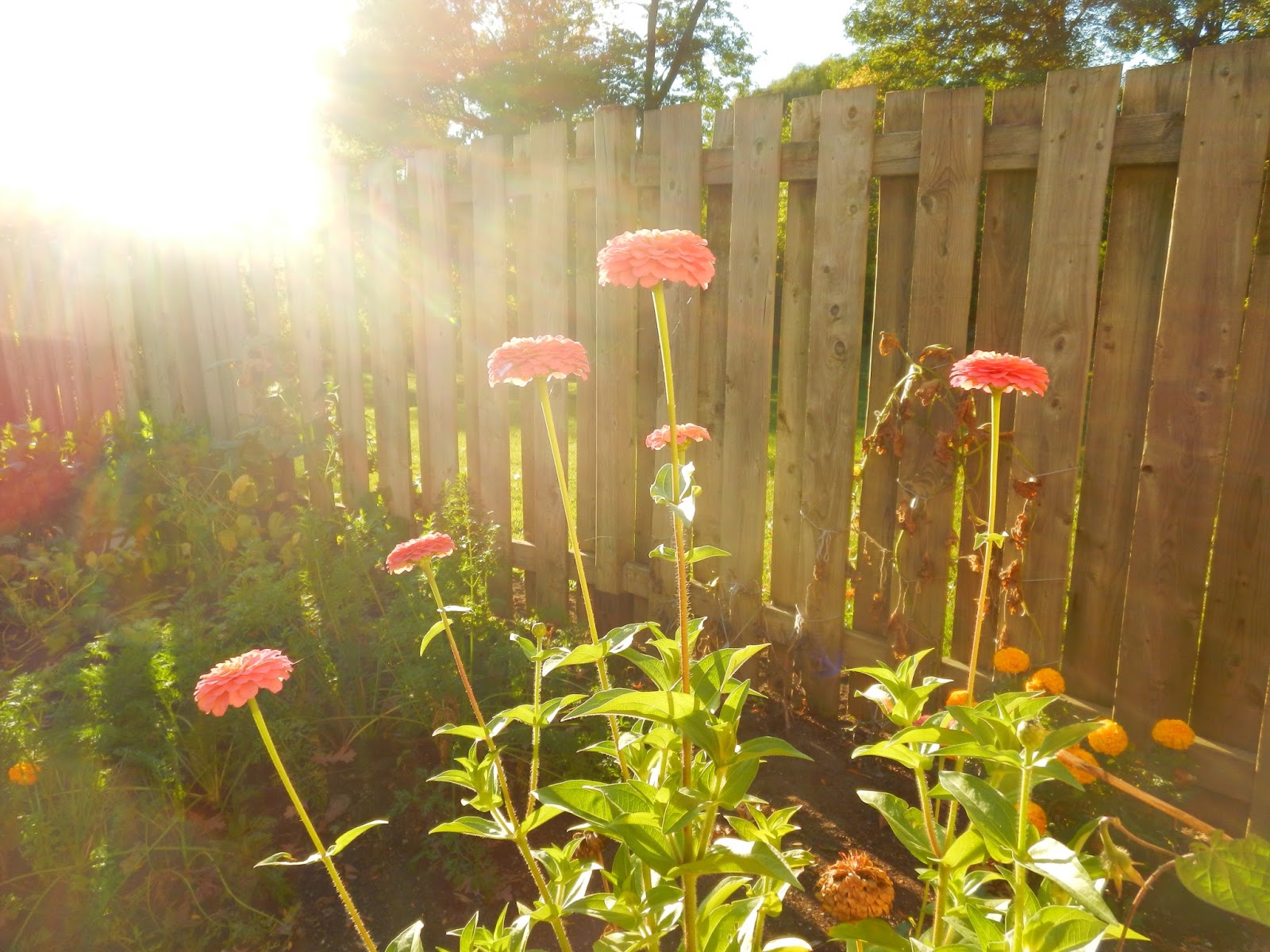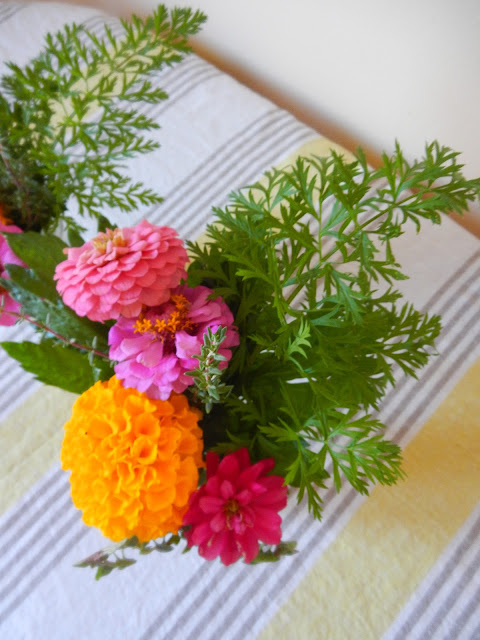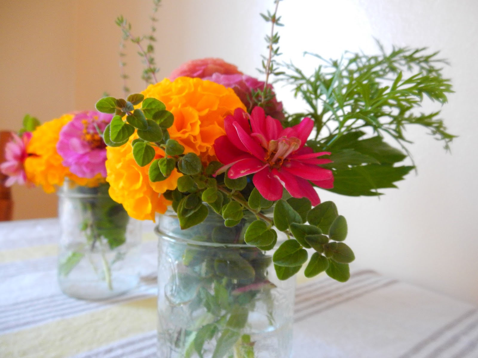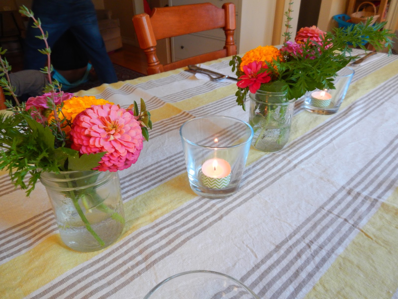 Once I had the kitchen under control and the tablecloth kind of ironed, I took a few minutes to raid the garden for some floral centerpieces. The flowers are legit, zinnias and marigolds. It’s the greens that look suspicious: celery leaves and carrot tops, thyme and oregano. Somehow it all seemed to work and the arrangements lasted for close to two weeks.