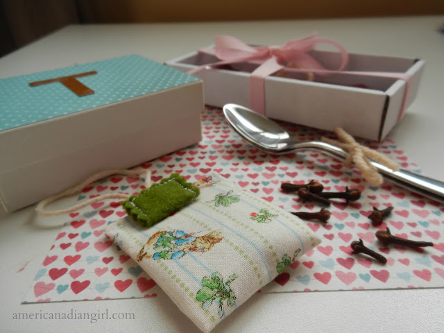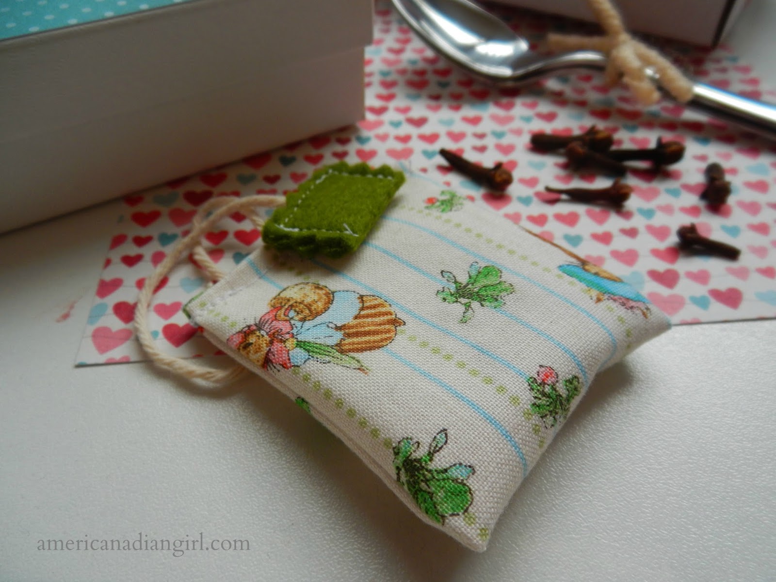 I decided to stuff some whole clove pieces in with the quilt batting to give them a pleasant scent during tea time play.