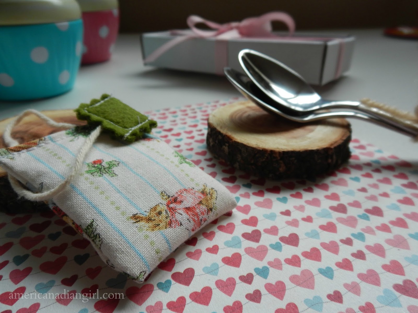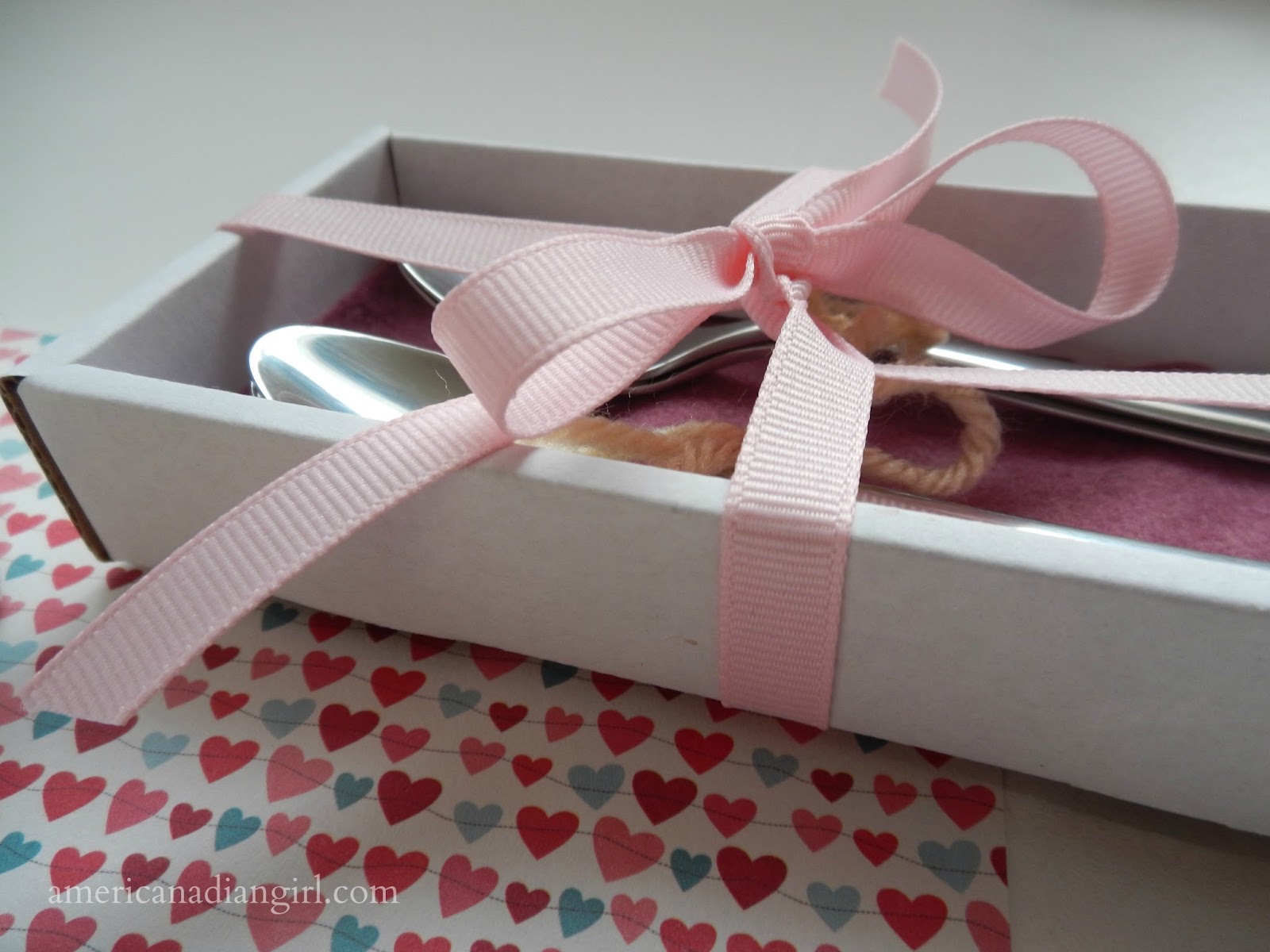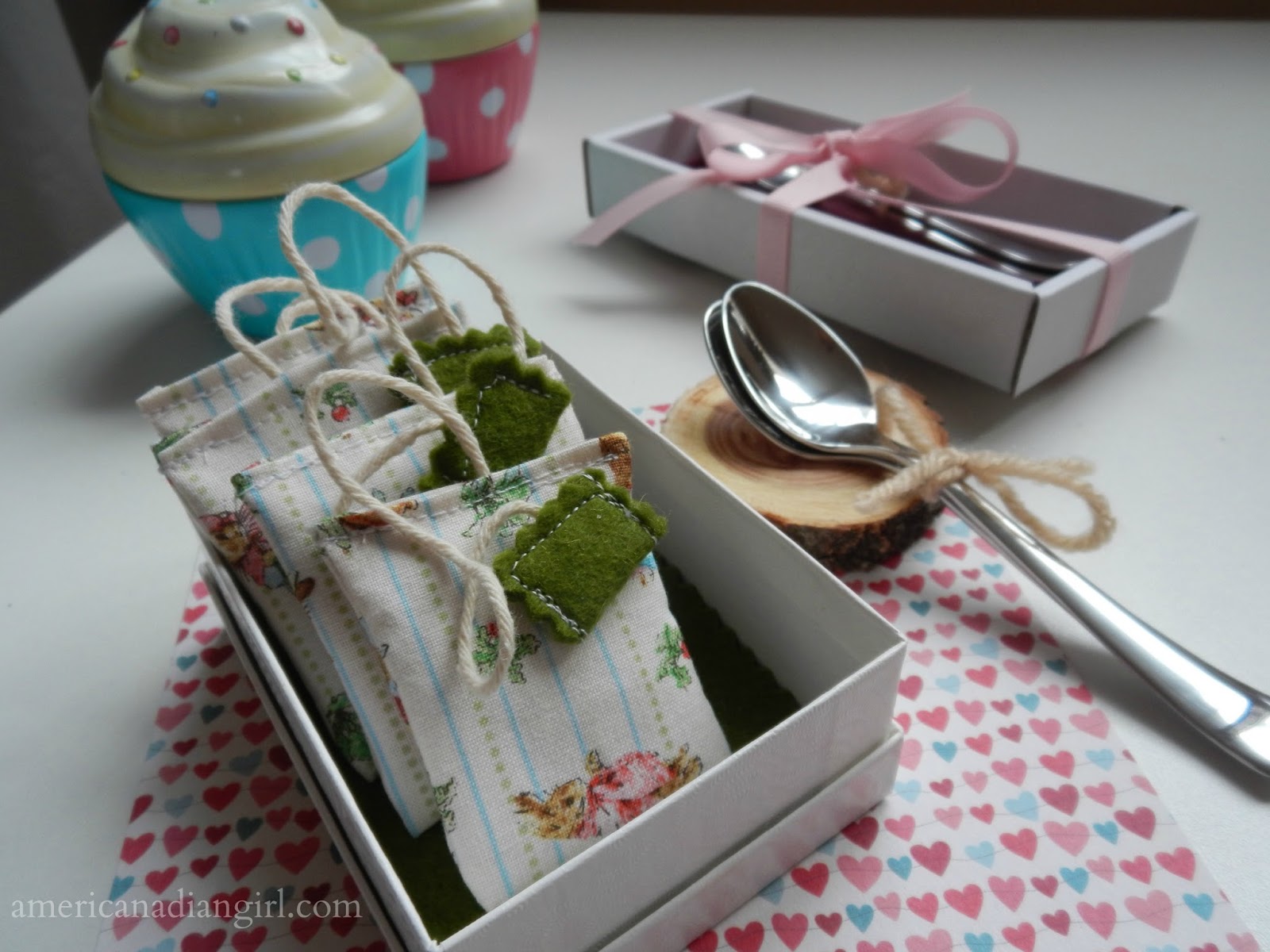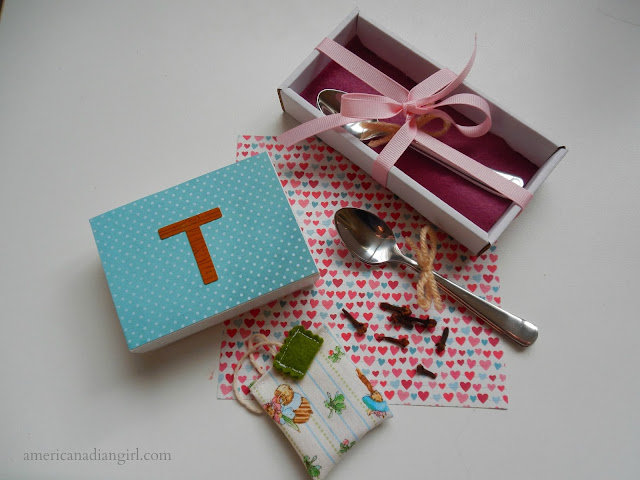 I decorated a little storage box that was easy to open and close and included a set of four demitasse-sized spoons from Ikea. I lined both the tea box and the spoon box with pieces of felt for beauty and softness.