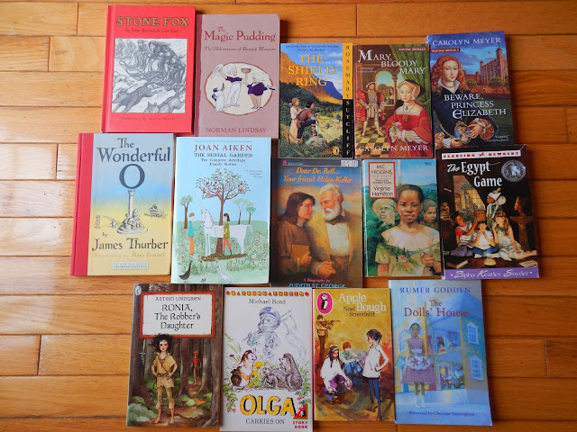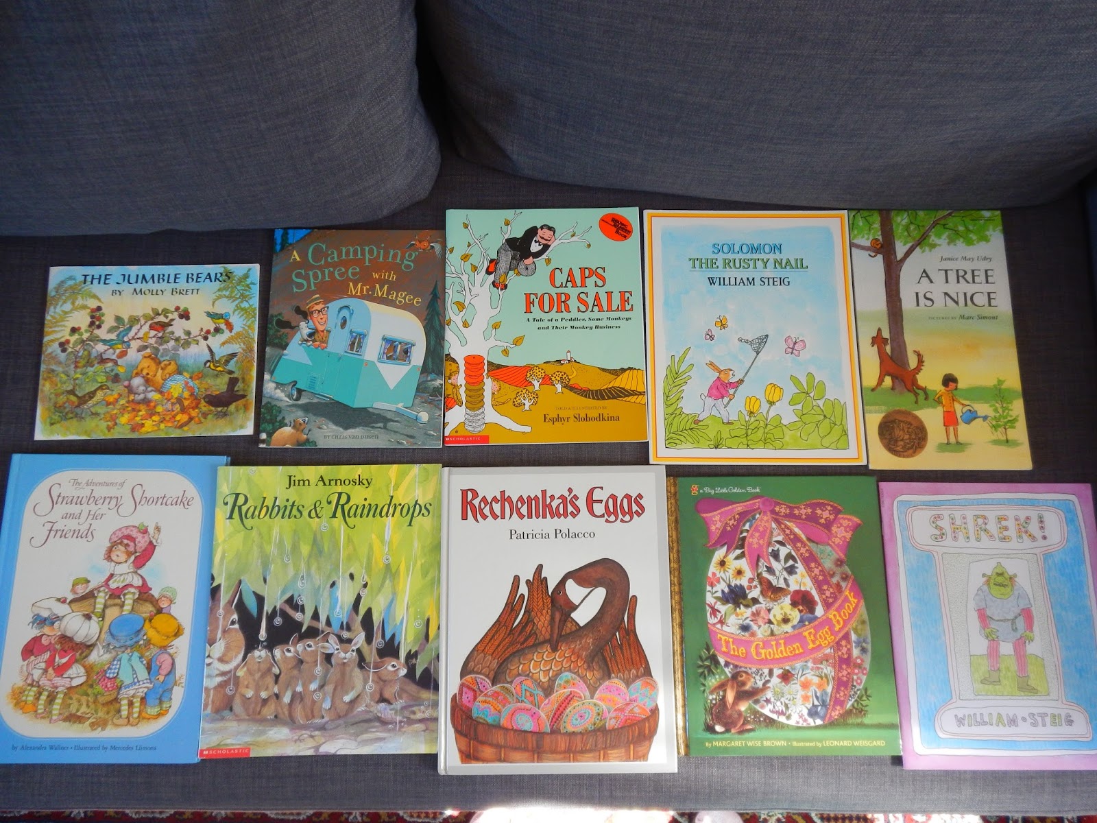 Pictured below are some of the books we brought home from a local annual book sale held every February. The Strawberry Shortcake book is a sentimental find for me. I grew up with what ebay searches now called Vintage Strawberry Shortcake and I had the story with the owl on the cover about winter not ending. We still have it, along with pillow characters and the pvc minatures that were artificially scented. My seven year old plays with them now.