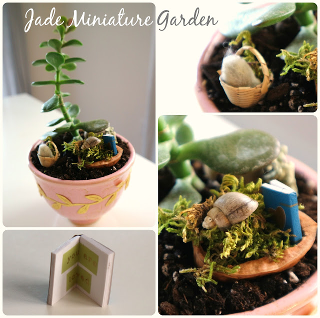 This little potted plant was a birthday gift for a sweet friend. I bought the pink pot from our local florist shop, wrapped some gold leaf ribbon around it and then added one of my own rooted jade plants with a few small rocks for drainage. Then I just started tucking in small items from my nature collection and miniatures that I found when we cleaned out my mom’s craft cabinet. The little basket has one pussy willow tuft leftover from my spring branches and the little book just needed some sticker love and the secret message tucked inside. ♥