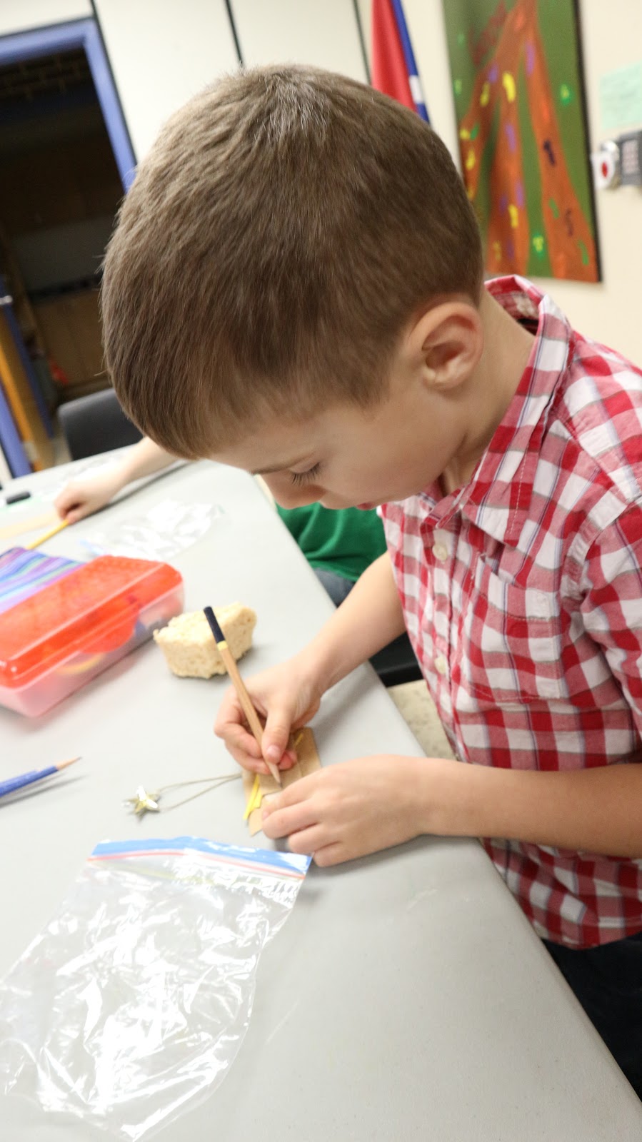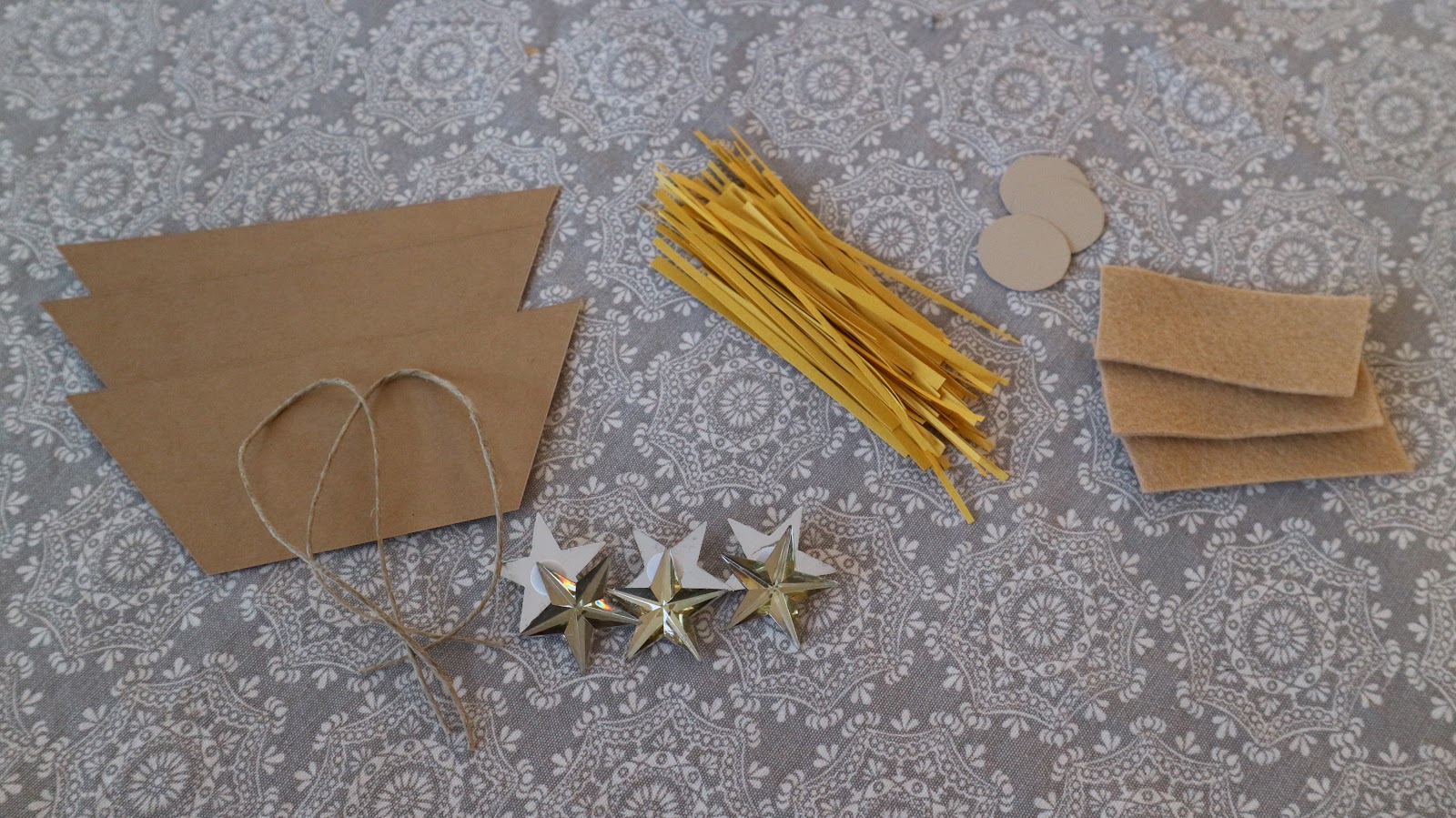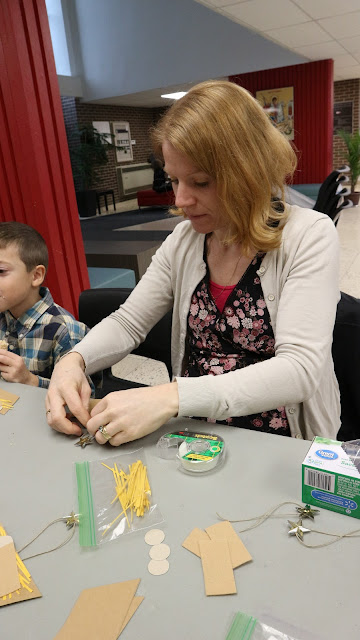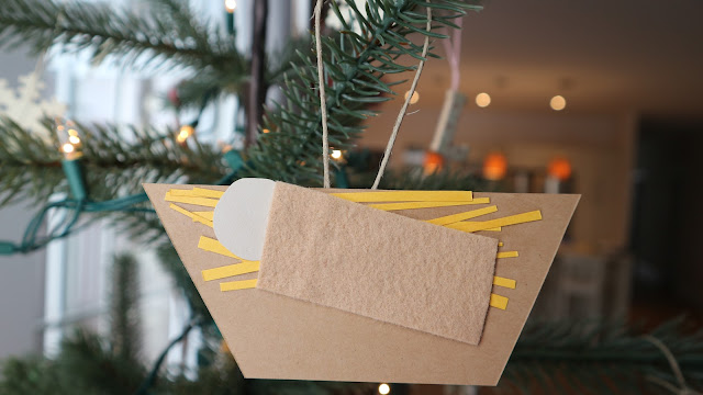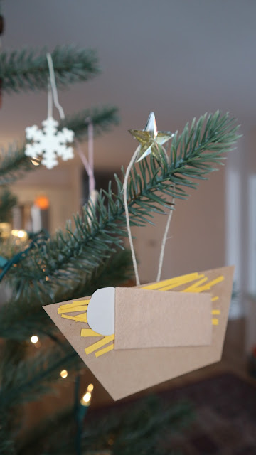 I prepped everything you see above, so they only had to assemble the pieces using a glue stick. I also stuck the stars together over the hemp cord in advance because I thought that the placement was tricky and important enough to hang correctly as an ornament. And then we gave them a piece of tape and helped them tape the ornament cord to the back so that it hung straight.