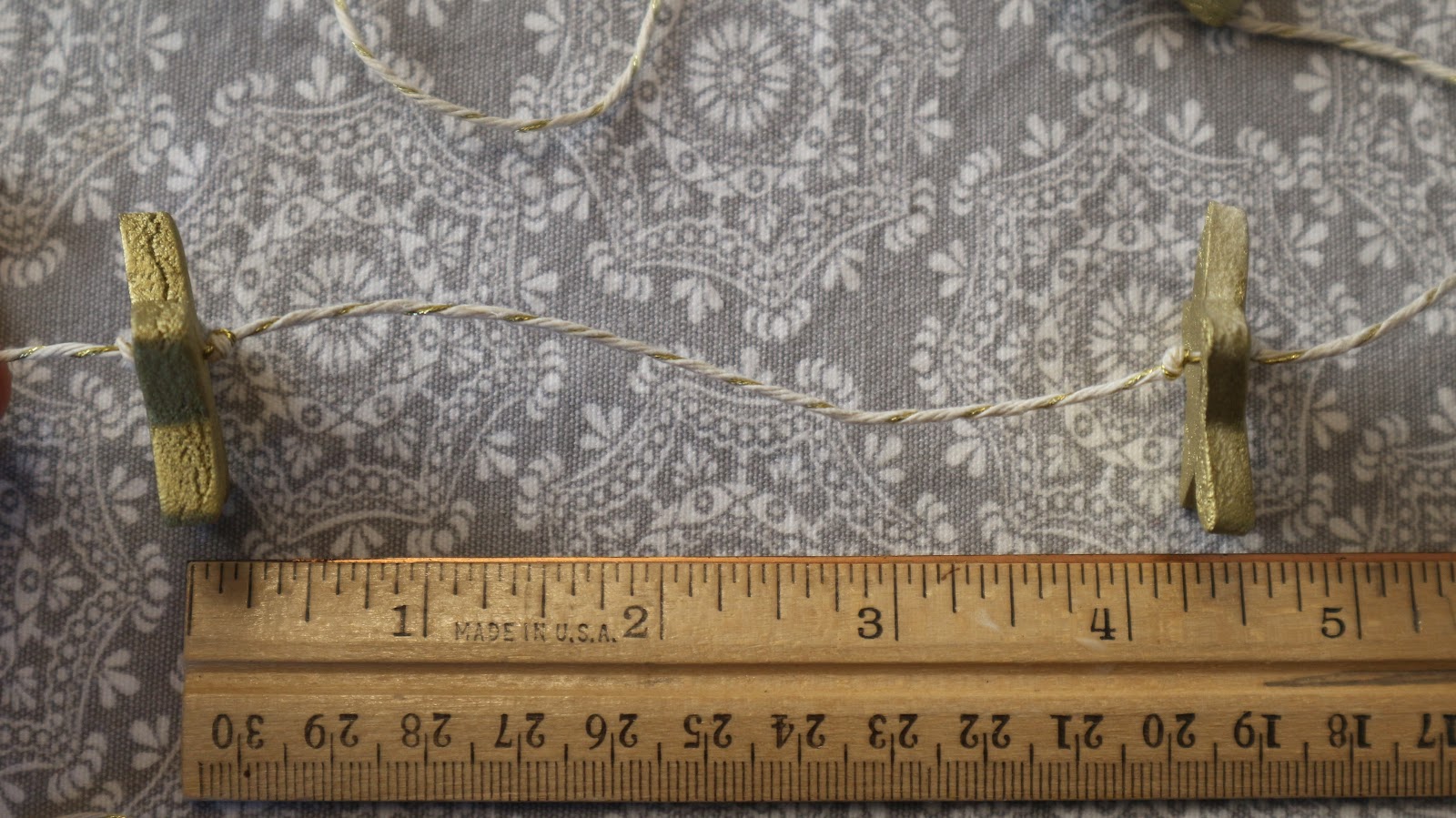 I took my hemp cord, put some tape over the end to prevent it from fraying and tied a knot on one end and added my first star. I quickly realized I don’t want them to move on the garland and risk crashing into each other and chipping paint. So I decided to tie another knot directly after the first star is on. Now each star will be secure on the garland kept in place between two knots. I got a ruler and measured about 4 inches and then tied another knot before loading another star onto my garland. Then I knotted that one into place and measured another 4 inches before tying another knot. I continued tying knots and adding stars until I thought it was long enough. I didn’t measure the garland because I didn’t need it to be an exact length. I tied off the last knot and cut my hemp cord.