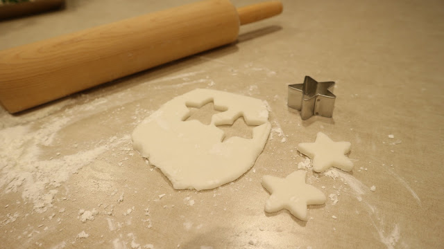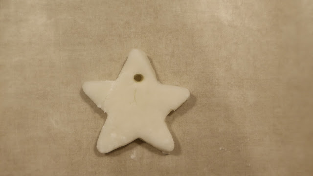 And then using a round toothpick or skewer stick, I poked a hole in the damp clay where I want to thread my cord. Now the stars go in a low heat oven and bake until they are hard.