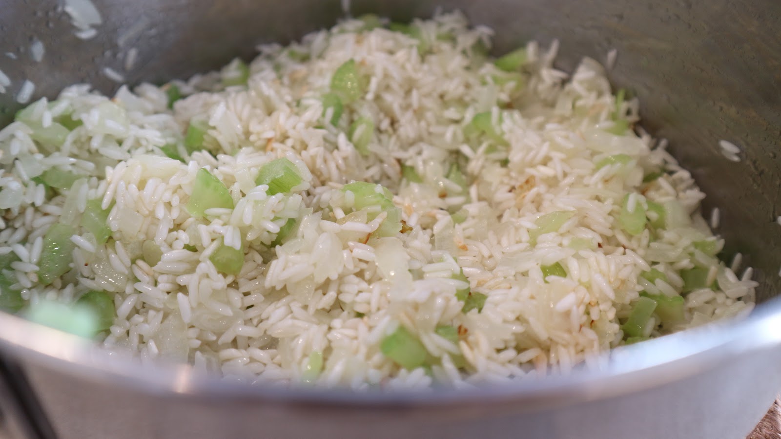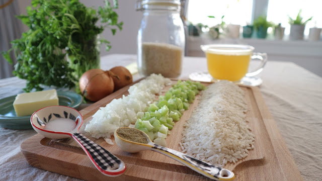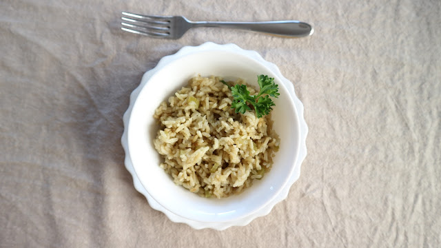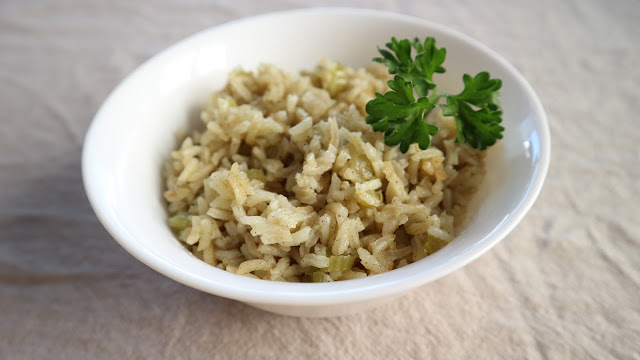 But I missed those flavors and one afternoon while working on dinner prep, I took a basic rice pilaf recipe that starts with cooking diced onion in butter and I decided to keep going adding the ingredients that make bread cubes become stuffing: celery and sage. It worked so well that although I was eating rice, the flavors evoked memories of Thanksgiving stuffing in my mind.
