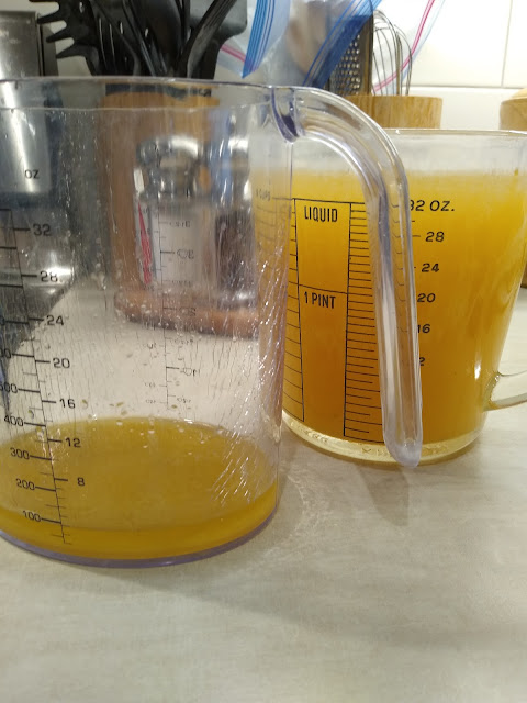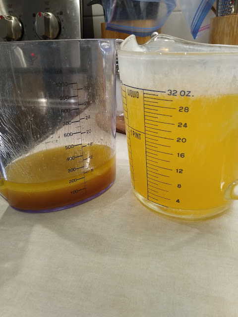 Already you can see how the juicy broth settles to the bottom and the fat sits on top. The gravy separator will allow you to pour off the broth and keep the fat from pouring out.