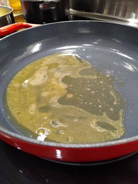So into the large skillet goes the fat from the gravy separator. You can scrape the inside with your rubber scraper to get most of the liquid into the skillet. Turn on the heat and bring your fat to medium heat so that it starts to bubble. Once, it’s bubbling, add the flour as seen next.