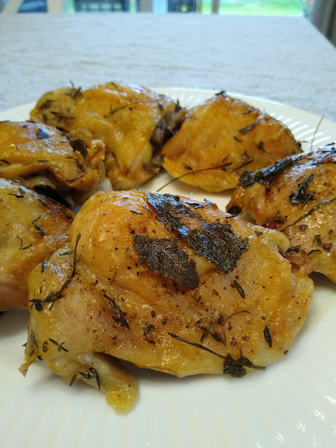 Here is the chicken fully cooked with crispy skin. I picked off most of the big pieces of herbs, but if you used regular dried herbs, you can skip that step. I probably baked this for 45 minutes, but you can use a meat thermometer if you’re nervous.