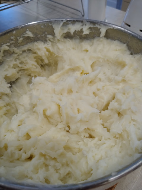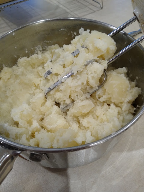 So while that simmers and thickens, let’s look at our cooked potatoes. I’ve boiled them until the fork slides in gently and then drained the water off the pot using the lid to keep the potatoes in the pot. Then after I’ve turned the heat off the burner, I put the potatoes back on the burner and let the excess water in the potatoes evaporate and dry out a little. Don’t let them sit too long and start to stick, but you can shake the pot a little and let them get bashed a up bit as they dry up nicely.