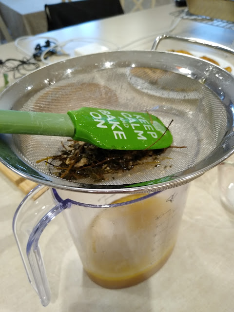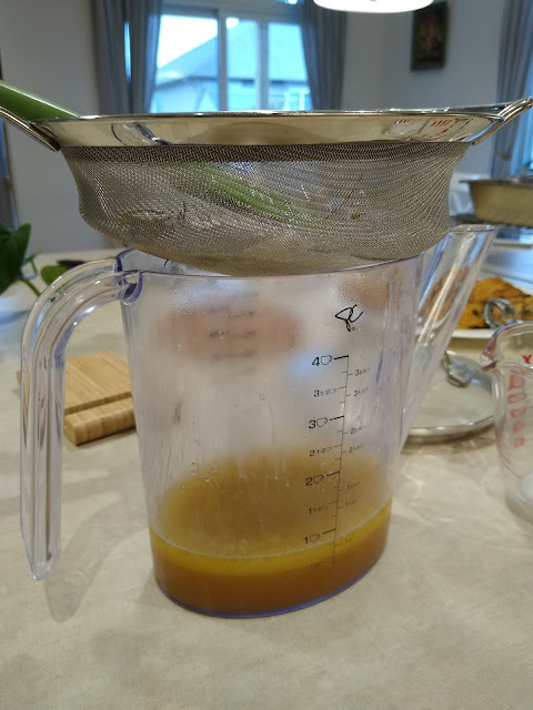 Here it is quite clear that the darker liquid on the bottom is the tasty broth you baked with and you will pour that off into the glass cup with your other broth made from chicken bullion.