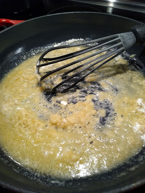 So now I have whisked the flour into the medium heated fat and everything is bubbling and ready to add my broth.