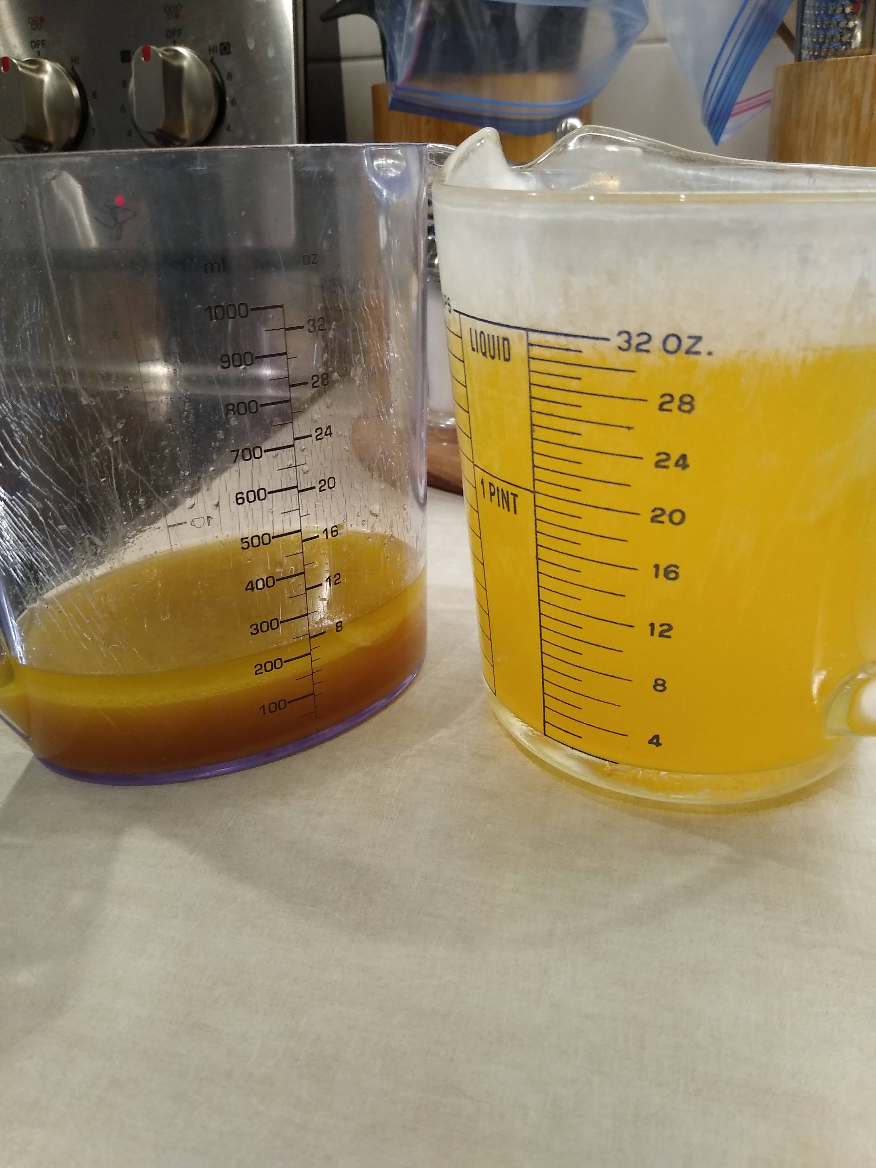 Already you can see how the juicy broth settles to the bottom and the fat sits on top. The gravy separator will allow you to pour off the broth and keep the fat from pouring out.