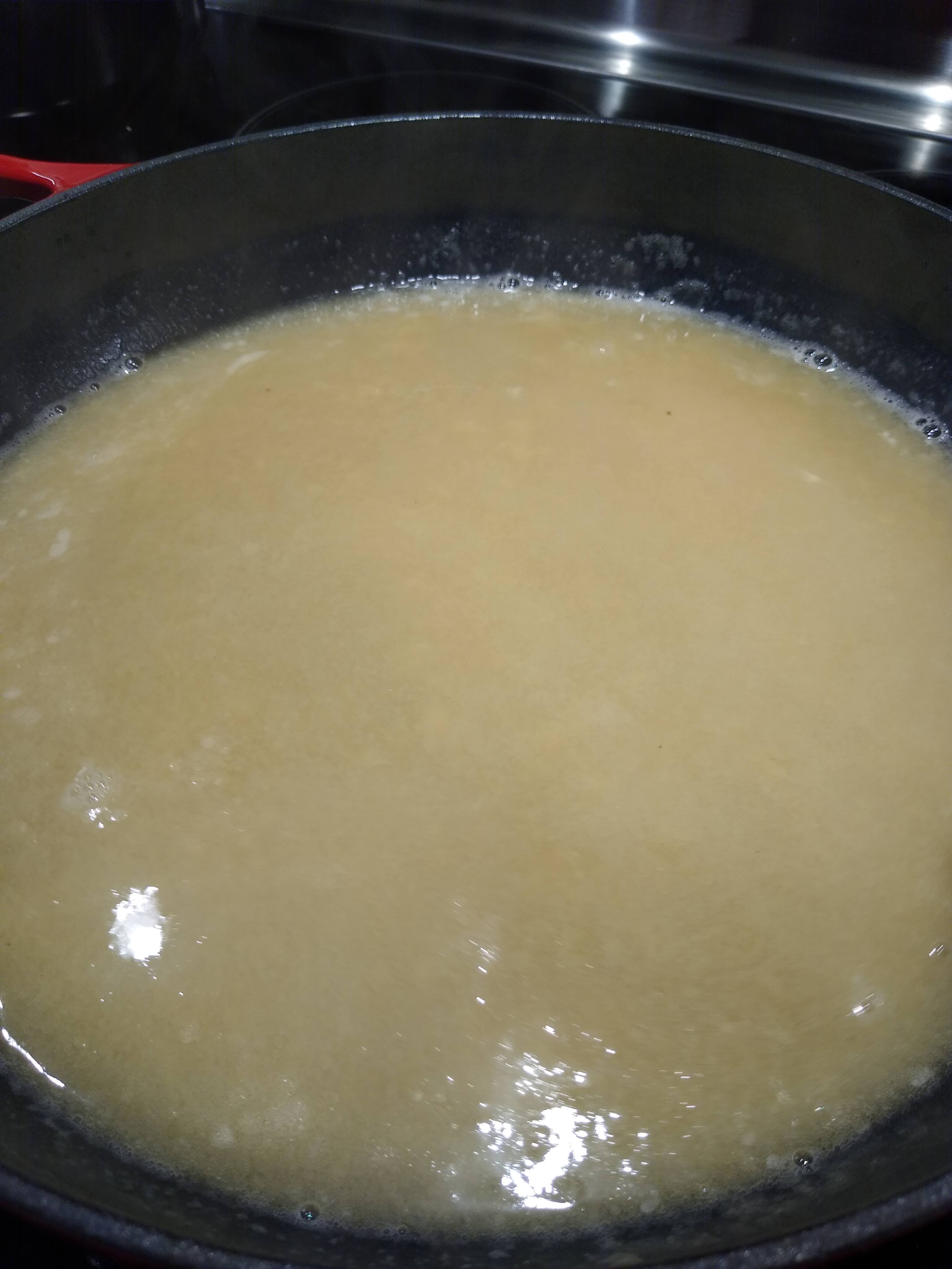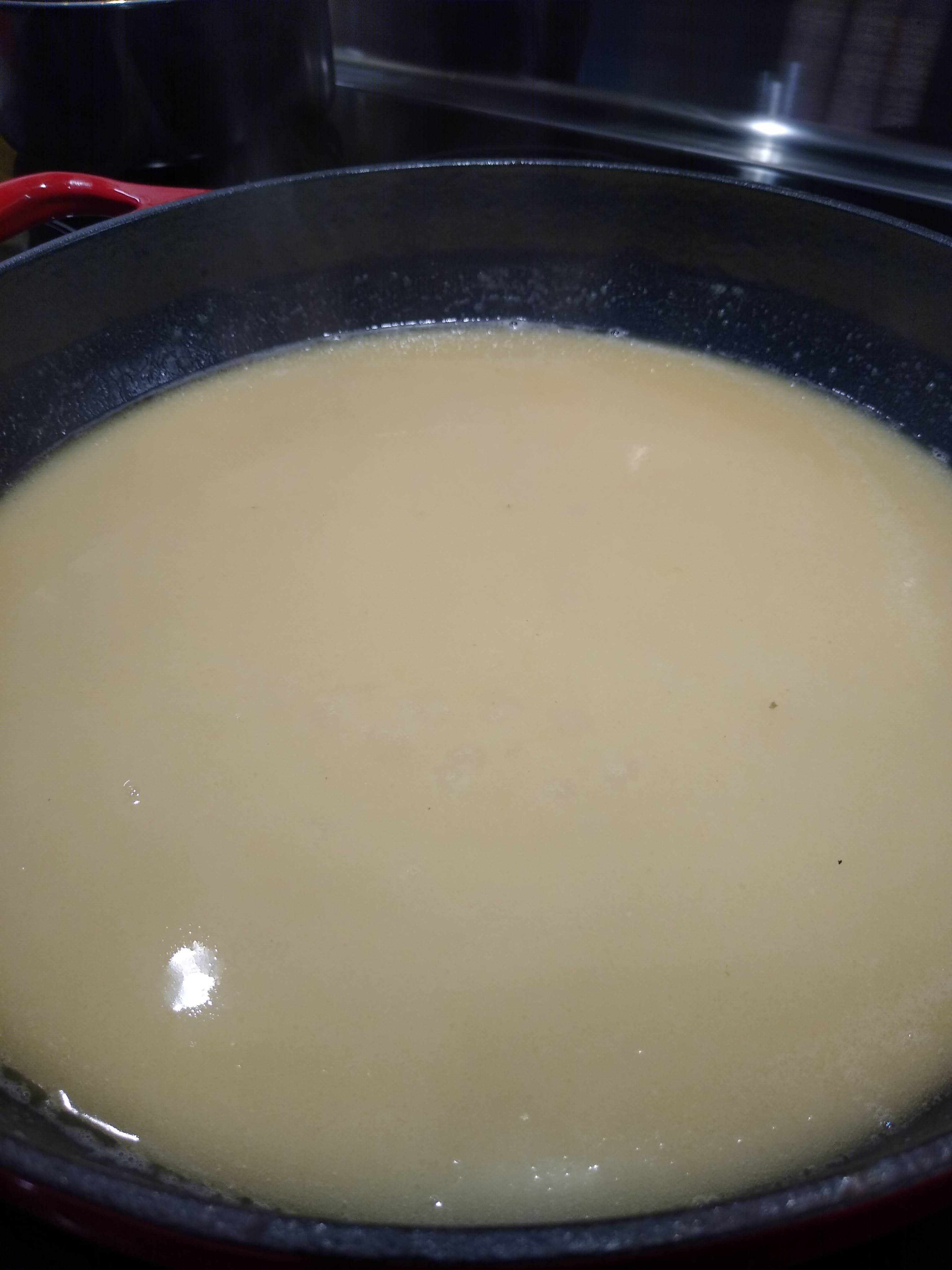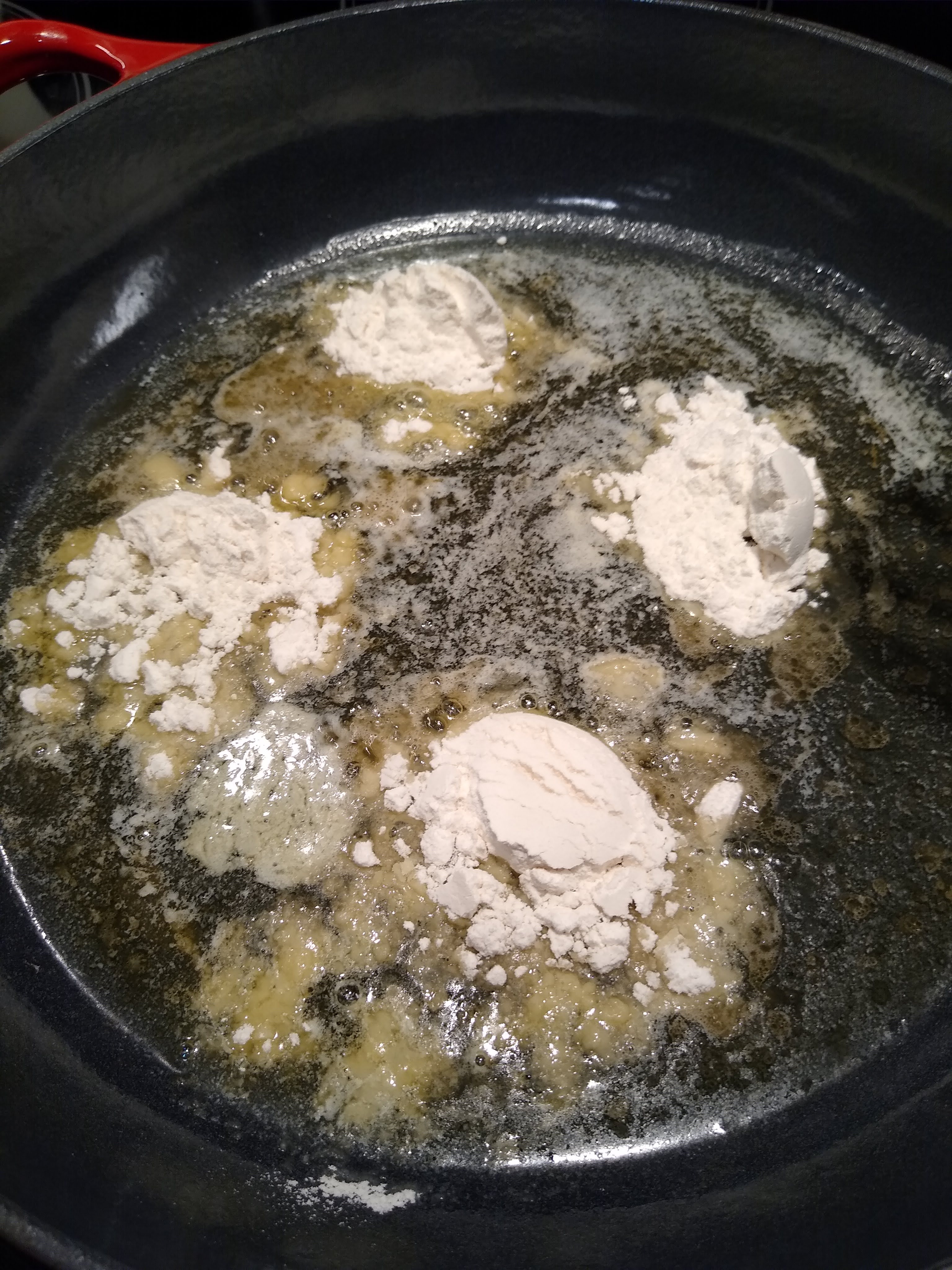 So now I have whisked the flour into the medium heated fat and everything is bubbling and ready to add my broth.