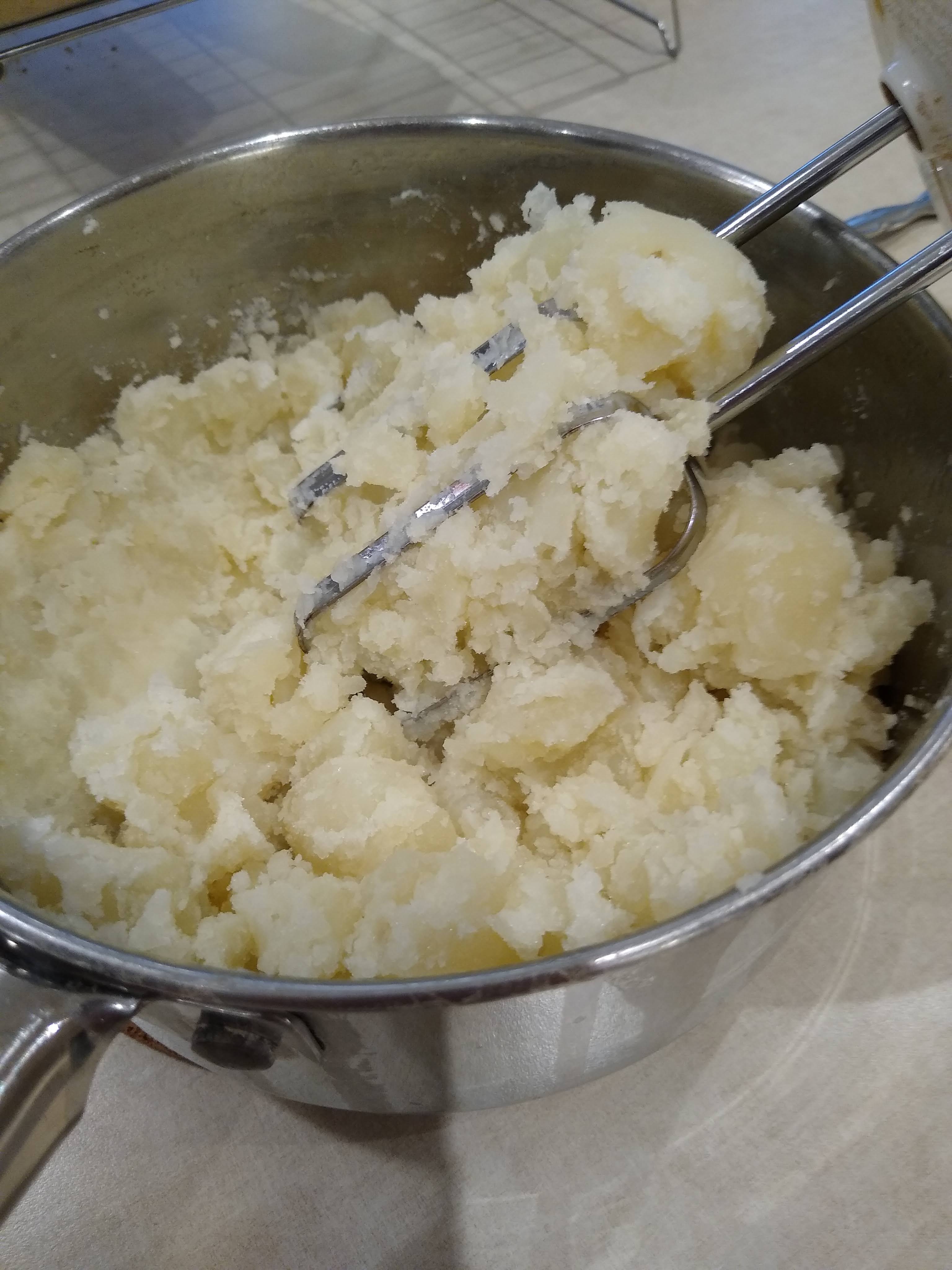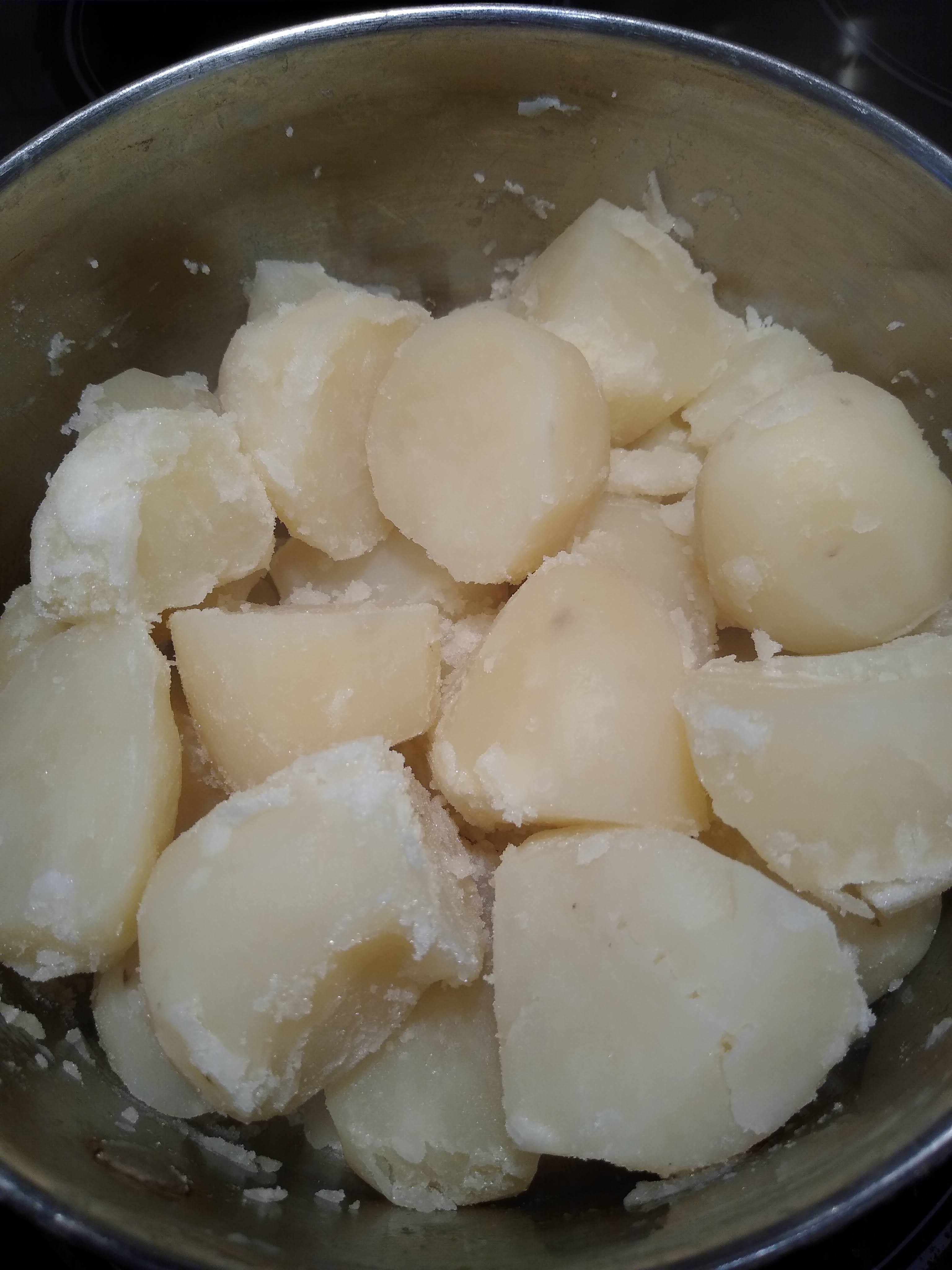 So while that simmers and thickens, let’s look at our cooked potatoes. I’ve boiled them until the fork slides in gently and then drained the water off the pot using the lid to keep the potatoes in the pot. Then after I’ve turned the heat off the burner, I put the potatoes back on the burner and let the excess water in the potatoes evaporate and dry out a little. Don’t let them sit too long and start to stick, but you can shake the pot a little and let them get bashed a up bit as they dry up nicely.